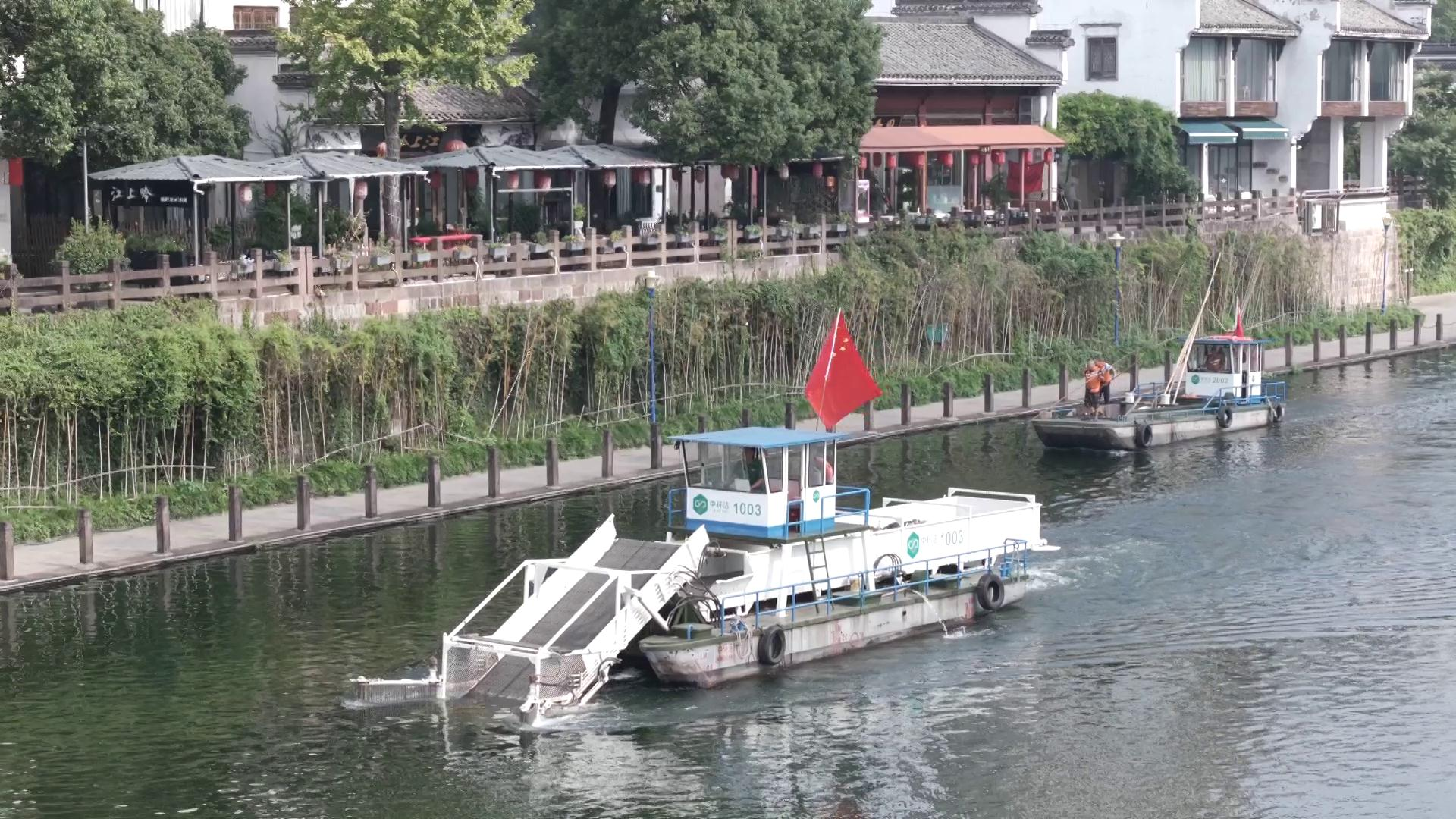 在屯溪区新安江保护延伸段,几条作业船正在忙碌地打捞水草及漂浮物。入秋后,昼夜温差加大,导致水草生长迅速,工作量因此比平时大增。为了确保河道的干净整洁,全体水上中队工作人员在双节期间延长了工作时间。“十一期间,游客增多,我们早上5点就上班了,把水面清理干净,因为劳动最光荣。”屯溪区城管执法局水上中队的打捞员钱正林说道。
