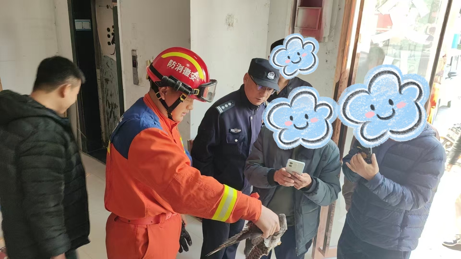为确保红隼安全脱险,民警迅速启动119应急联动机制,请求江北消防大队专业支援。消防人员抵达后,与民警协同制定救援方案,利用专业工具和丰富经验,在确保人员和红隼安全的前提下,小心翼翼地开展营救。经过多方密切配合与不懈努力,最终成功将这只受惊的红隼安全救出。