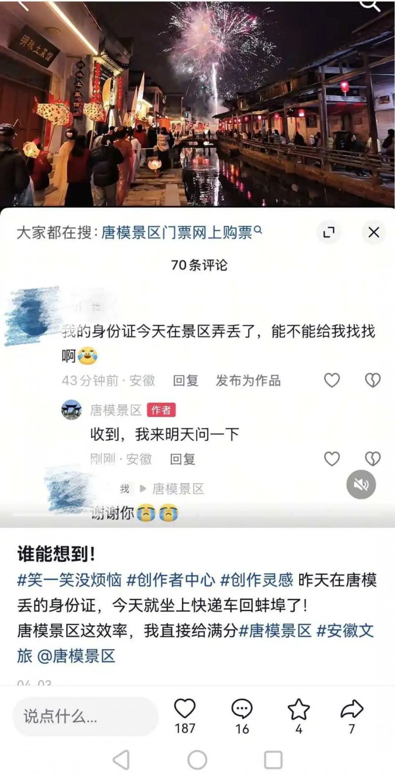 一句“得赶紧”,跑出服务加速度。近日,一场围绕遗失身份证的暖心接力在黄山市徽州区潜口镇唐模景区上演。游客卢女士游玩时不慎遗失证件,通过抖音私信焦急求助,景区工作人员第一时间响应安抚、细致核查信息;票房工作人员整理时发现遗失身份证,脱口而出的一句话最能代表景区态度:“得赶紧联系上客人!”迅速核对后,当即快递寄还。失而复得的卢女士惊喜感动,在社交平台主动为景区暖心服务点赞致谢。