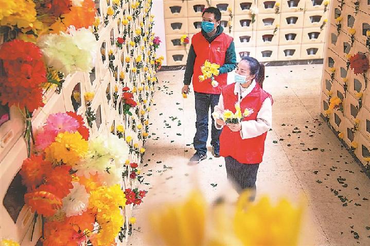 3月30日,合肥市包河区义城街道20余名志愿者来到包河区文化陵园开展集体代扫活动,此次祭扫义城街道提供了2.4万枝鲜花。为减少疫情期间市民出行,避免墓园人员聚集,合肥市民政局开展了网上祭祀和代为祭扫服务。 本报记者 李博 摄