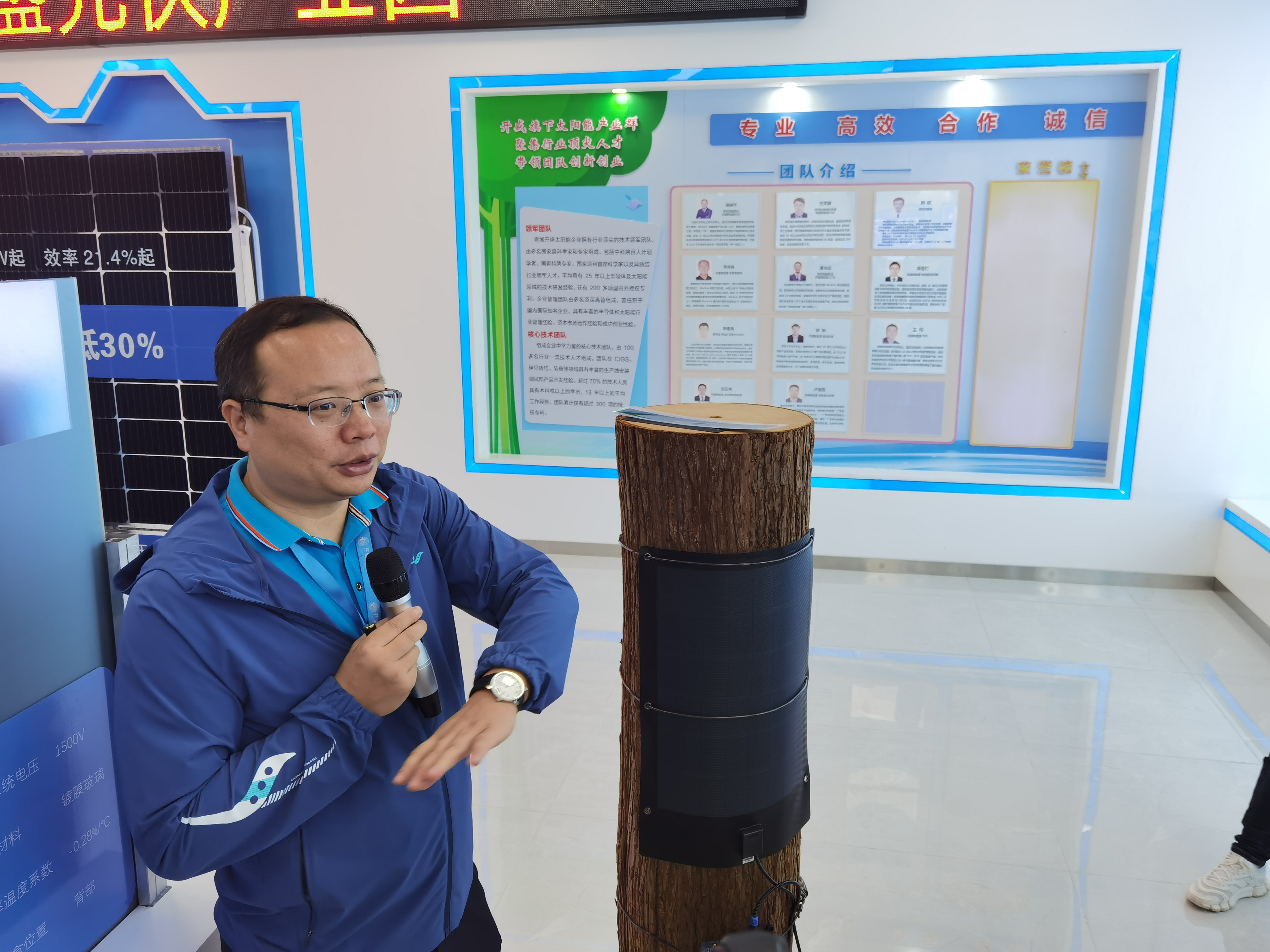 “以前拍摄野生动物的监控器是电池供电,人工定期要去深山换电池成本太高,现在安装铺设了这个柔性光伏板,绑在深山老林里的树上,可以利用弱光发电,安全又便捷,解决了动物保护系统的运维成本。”宣城开盛光伏产业园徐晓华,指着一款像布一样柔软的柔性光伏板介绍着。