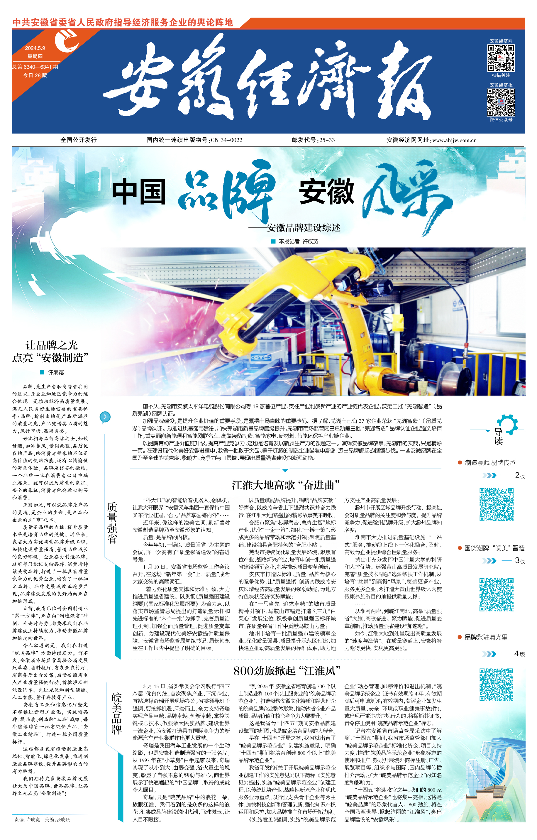 以品牌带动产业价值链升级,提高产业竞争力,这也是培育发展新质生产力的课题之一。演绎安徽品牌故事,芜湖市的实践,只是精彩一页。在建设现代化美好安徽进程中,我省一批敢于突破、勇于赶超的制造企业瞄准中高端,迈出品牌崛起的铿锵步伐。一些安徽品牌在全国乃至全球的美誉度、影响力、竞争力与日俱增,展现出质量强省建设的澎湃动能。