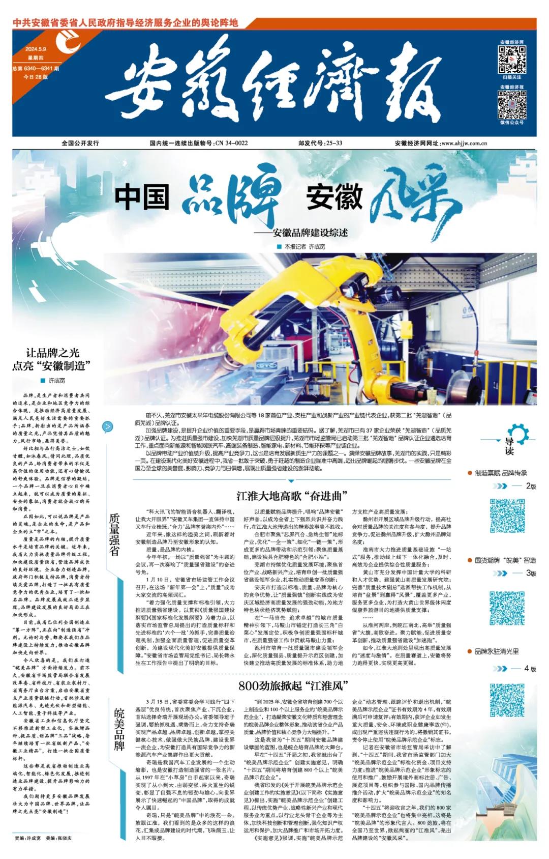 5月10日,第八个中国品牌日如约而至。在这个具有特殊意义的日子,《安徽经济报》以铿锵的笔触,述说本土品牌的崛起之路,描绘新兴品牌的创新之光,亮出品牌出海的国际风采……每篇报道都是一幅跌宕起伏的故事,每个细节都是一抹璀璨的色彩,共同绘就安徽品牌发展的壮美图景。