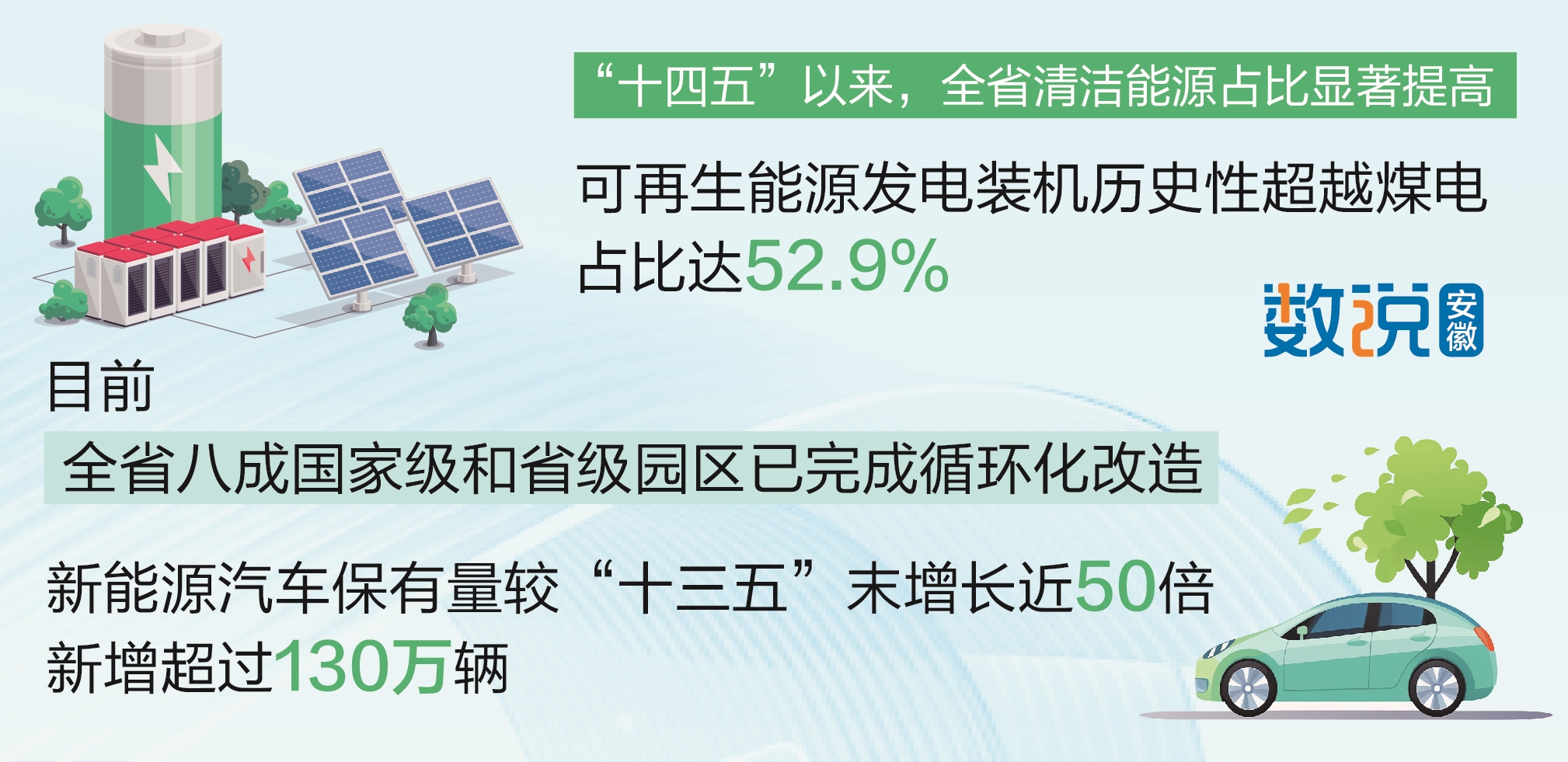 “十四五”以来,安徽坚定不移走生态优先、绿色低碳发展道路,大力推进传统产业高端化、智能化、绿色化升级,加快构建绿色低碳循环经济体系。全省清洁能源占比显著提高,可再生能源发电装机历史性超越煤电,占比达52.9%。目前,全省八成国家级和省级园区已完成循环化改造,合肥、芜湖绿色货运配送示范工程扎实推进。