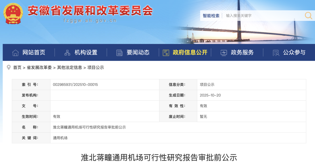 近日,安徽省发展改革委网站发布《淮北蒋疃通用机场可行性研究报告审批前公示》。