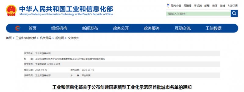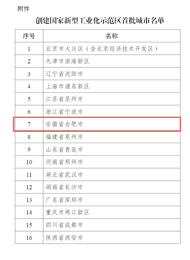 3月16日,记者从相关部门获悉,工业和信息化部正式公布创建国家新型工业化示范区首批城市名单,全国共16个城市入选,合肥市榜上有名,标志着合肥在推进新型工业化、打造先进制造业高地方面获得国家级战略认可。