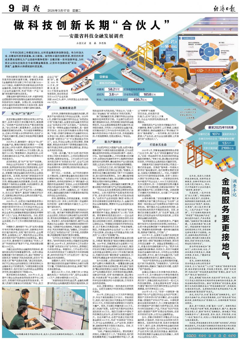 更多探索在系统推进。2024年10月,全国中小微企业资金流信用信息共享平台上线运行,实现银行间资金流信用信息共享。中国人民银行安徽省分行积极推广平台,助力企业以“信”换“贷”。截至2025年12月末,安徽共查询58.2万笔资金流信用信息报告,结合报告成功为3.8万户企业发放贷款1858亿元;其中,为科技型企业发放贷款496.7亿元。