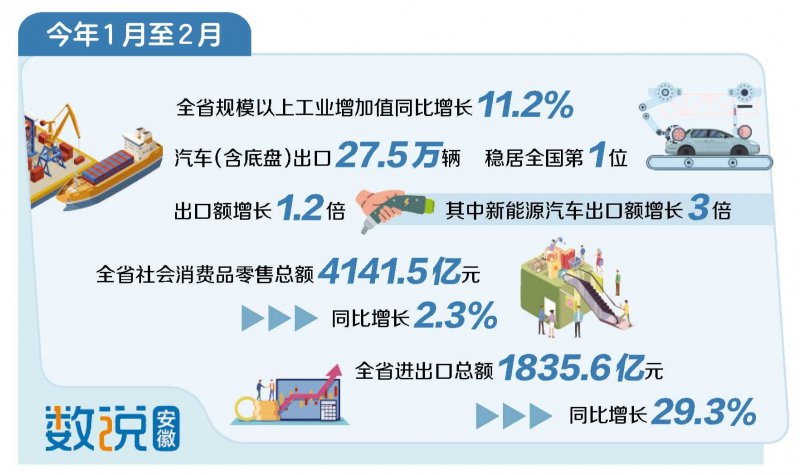 本网讯(记者 王弘毅)3月19日,省统计局发布了今年1月至2月经济运行情况。数据显示,前2个月,全省经济稳中向好、起步有力,全省规模以上工业增加值同比增长11.2%;汽车(含底盘)出口27.5万辆、稳居全国第1位,出口额增长1.2倍,其中新能源汽车出口额增长3倍。