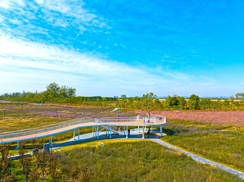 湿地公园大门、景观亭廊、木栈道、亲水平台、滨水广场、宣教广场等设施错落分布,河滩湿地植被恢复与湿地植物园相得益彰。整个示范区既保留了长江湿地的原生风貌,又为市民提供了丰富多元的生态体验空间。
