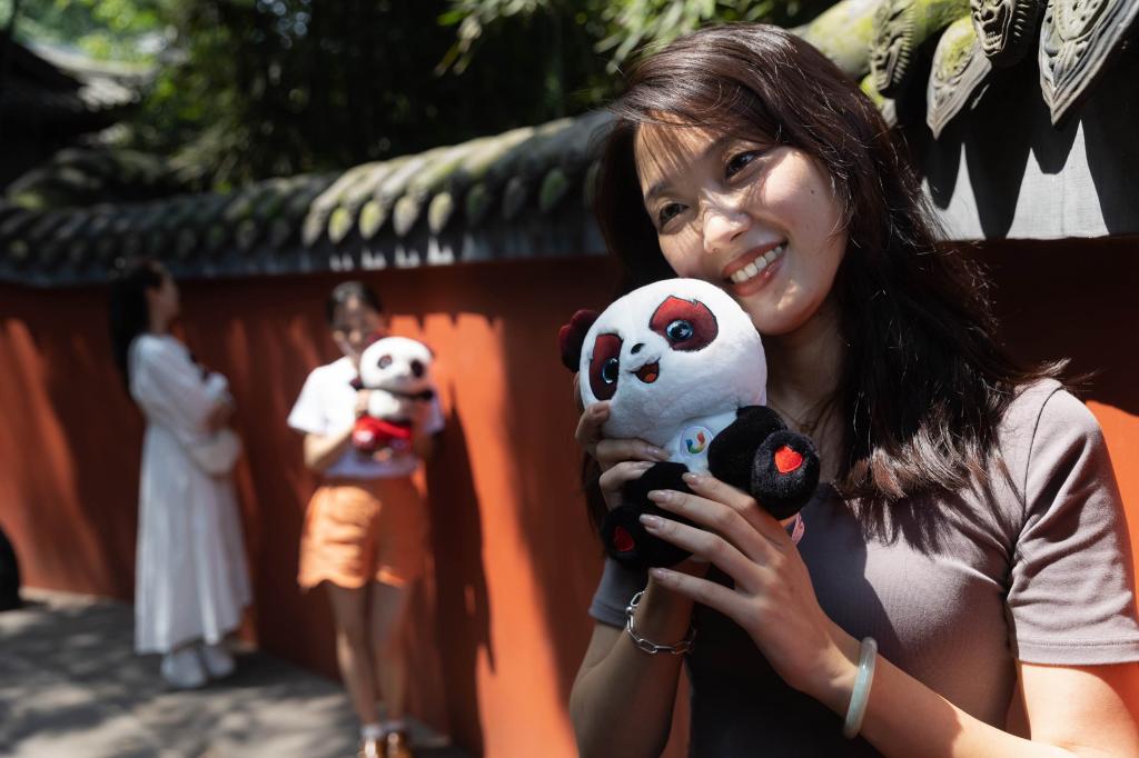 7月19日,游客手捧成都大运会吉祥物“蓉宝”在杜甫草堂的红墙边留影。新华社记者 江宏景 摄