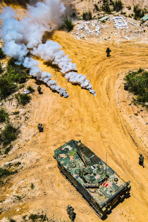 陆军第73集团军某旅“强军精武红四连”组织官兵开展连贯战术训练(2023年5月30日摄)。新华社发(刘志勇 摄)