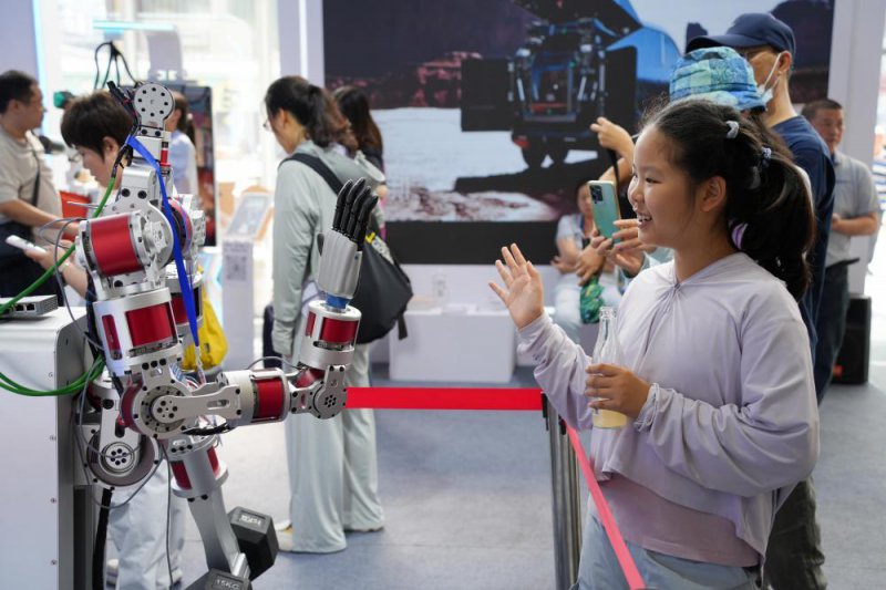 △2025年服贸会公众开放日第一天,参观服贸会的小朋友向机器人打招呼。