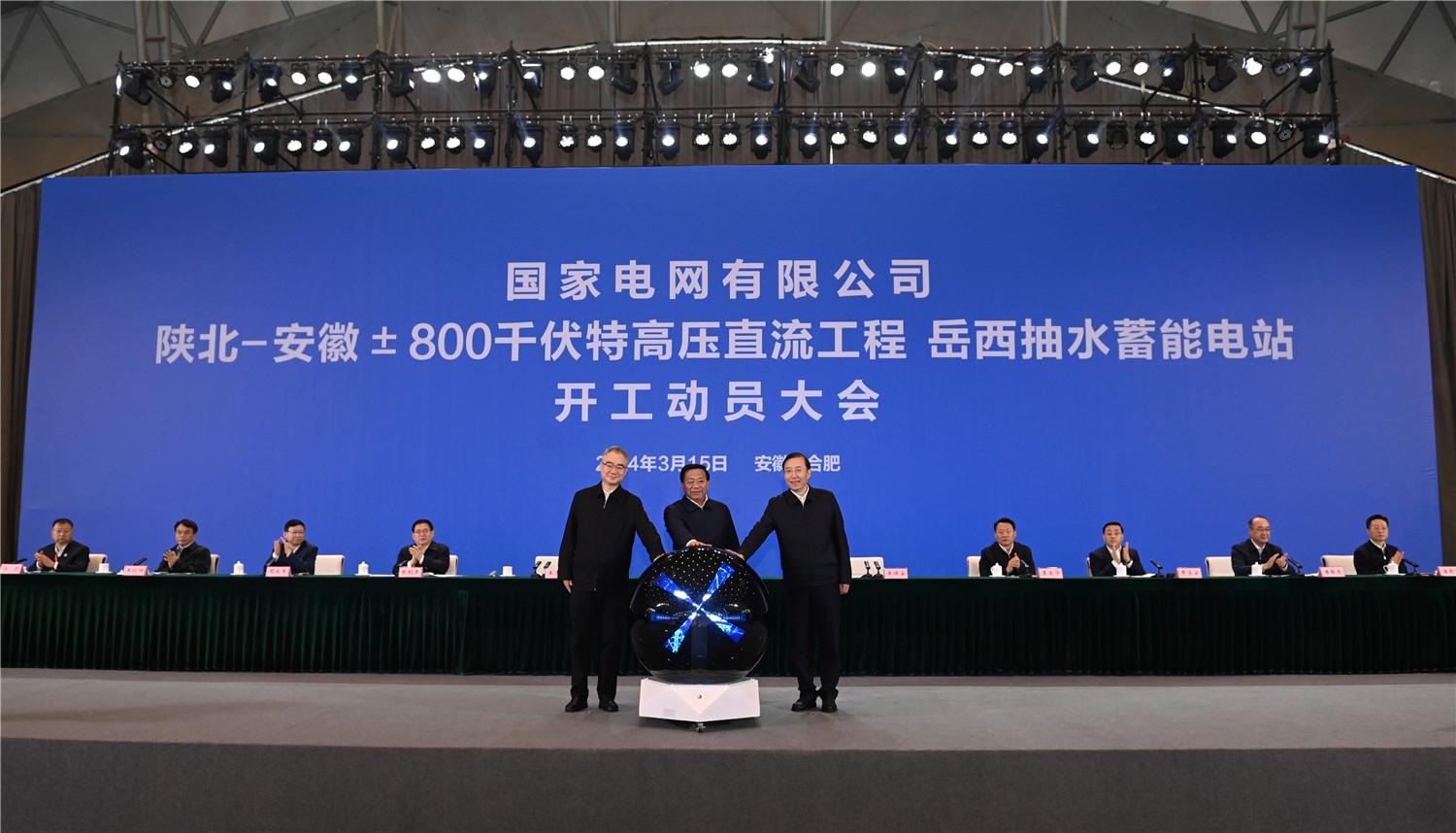 本网讯(通讯员 宗禾 记者 朱胜利)3月15日上午,国家电网有限公司陕北—安徽±800千伏特高压直流输电工程和岳西抽水蓄能电站开工动员大会,在安徽、陕西两地以视频连线形式同步举行。省委书记韩俊、陕西省委书记赵一德分别在安徽主会场、陕西主会场出席。省委副书记、省长王清宪,陕西省委副书记、省长赵刚,国家电网有限公司党组书记、董事长辛保安分别讲话。省委副书记、合肥市委书记虞爱华,省领导张韵声、费高云,陕西省领导王晓、王琳,国家电网有限公司总经理张智刚出席。