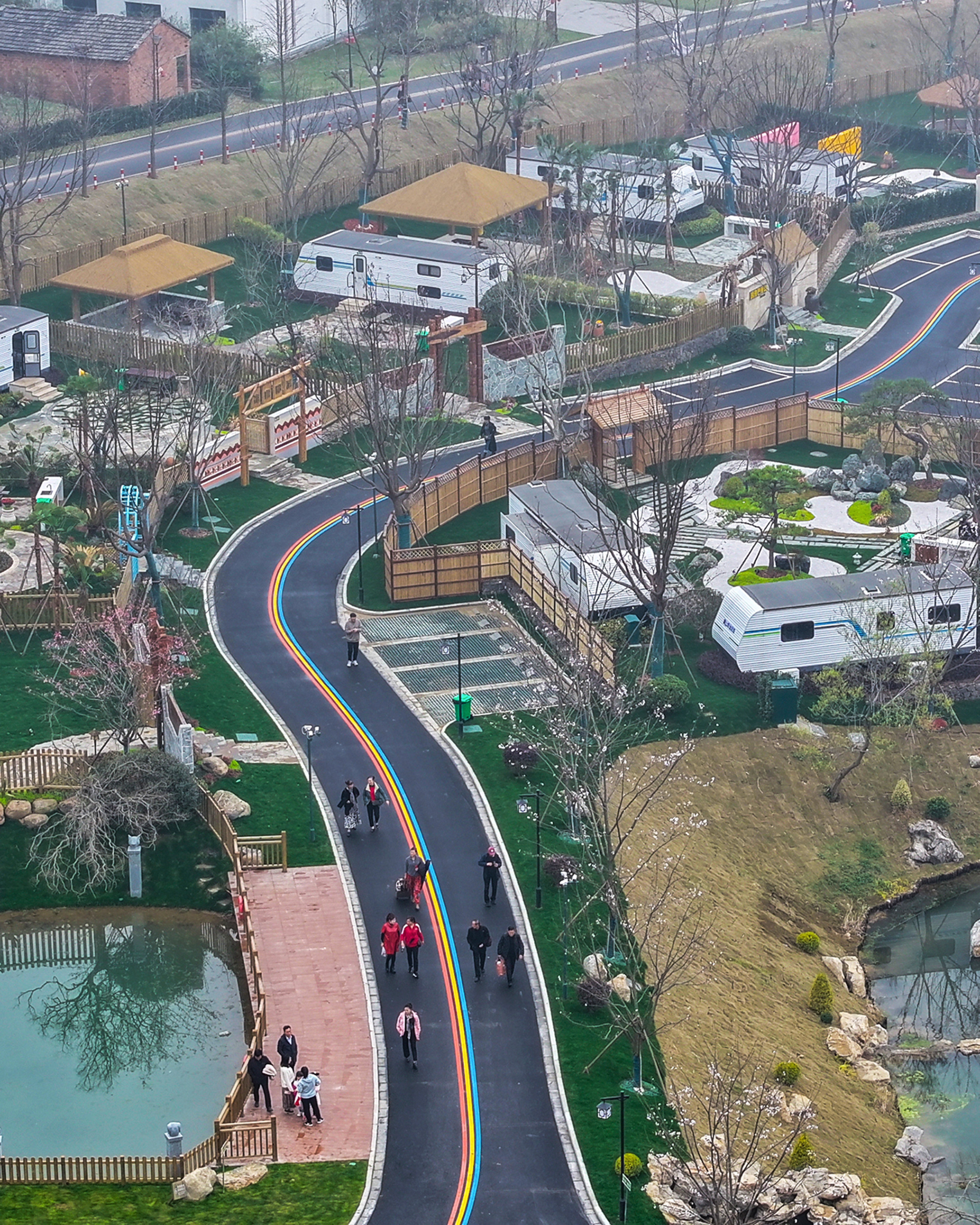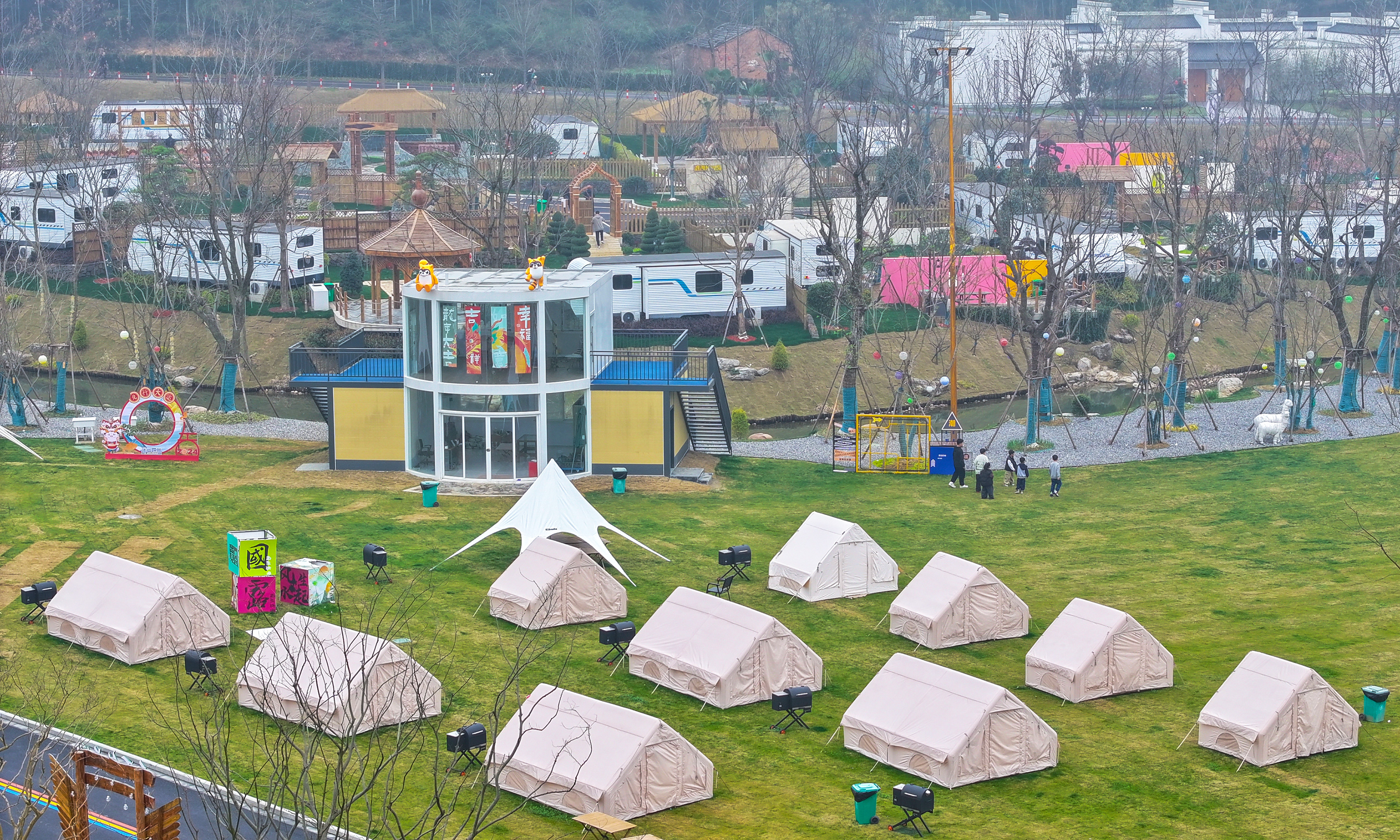 3月24日,在芜湖市繁昌区孙村镇中分村境内的途居马仁山房车露营地,优美的乡村生态环境,吸引众多游客前来游玩。