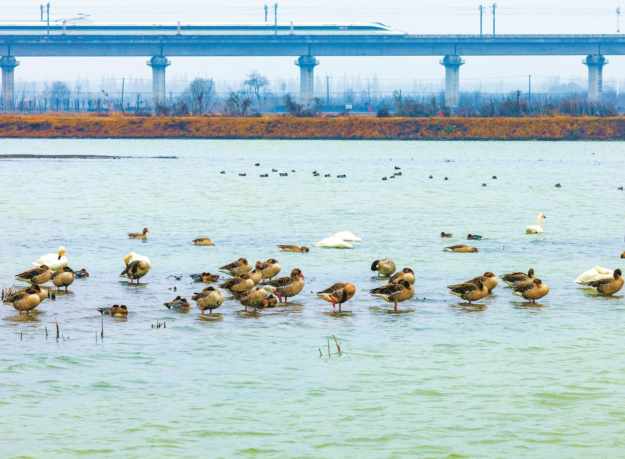 在肥东县长临河镇十八联圩生态湿地,小天鹅、白琵鹭、灰雁、琵嘴鸭等成群的候鸟聚集在水面游弋、觅食、嬉戏。(资料图片)本报通讯员 陈 振 摄