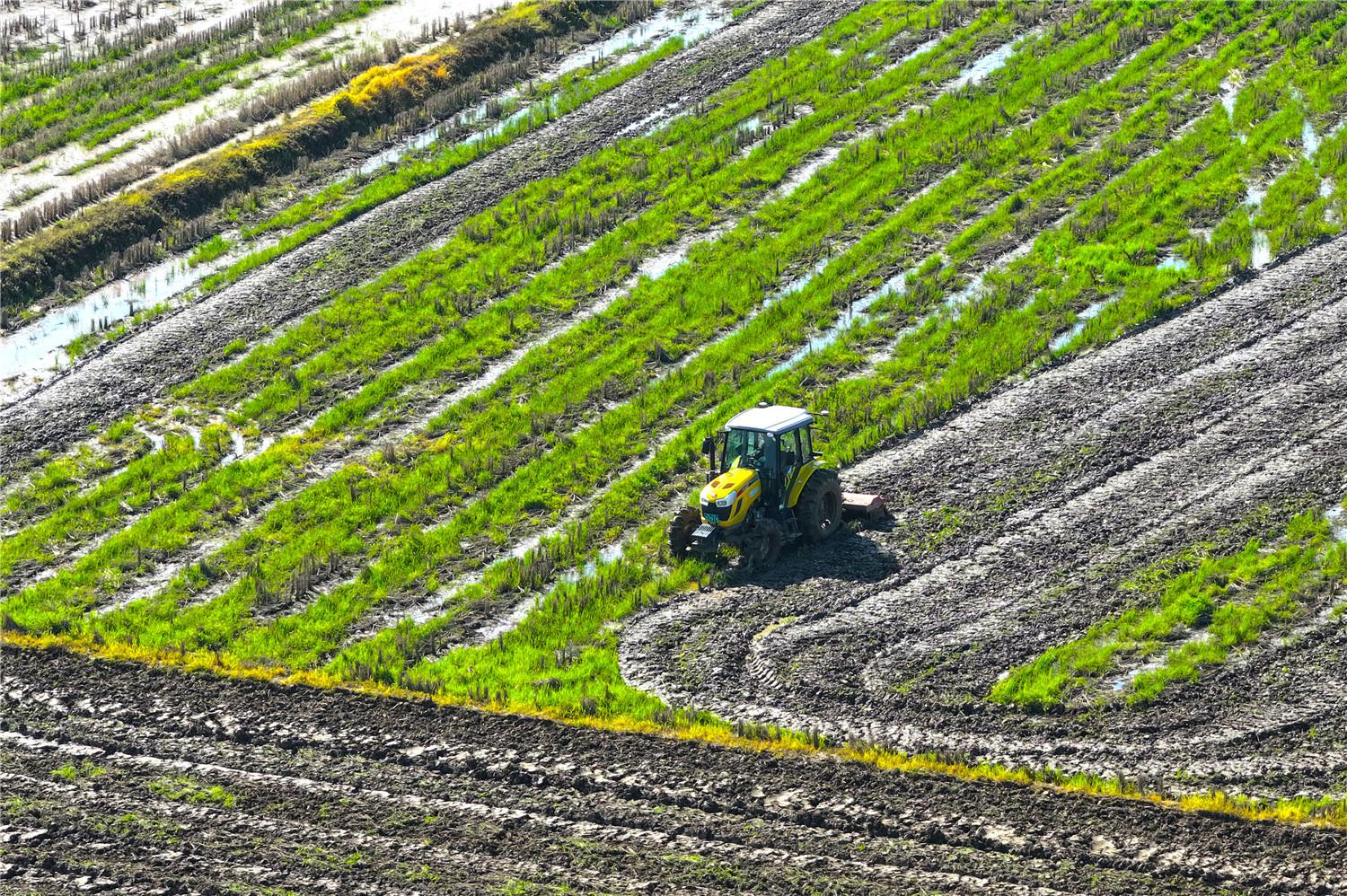 4月5日,芜湖市繁昌区峨山镇沈弄村农民在进行机械化犁地作业(无人机照片)。连日来,各地抢抓农时开展农业生产,田间地头随处可见忙碌的春耕景象。
