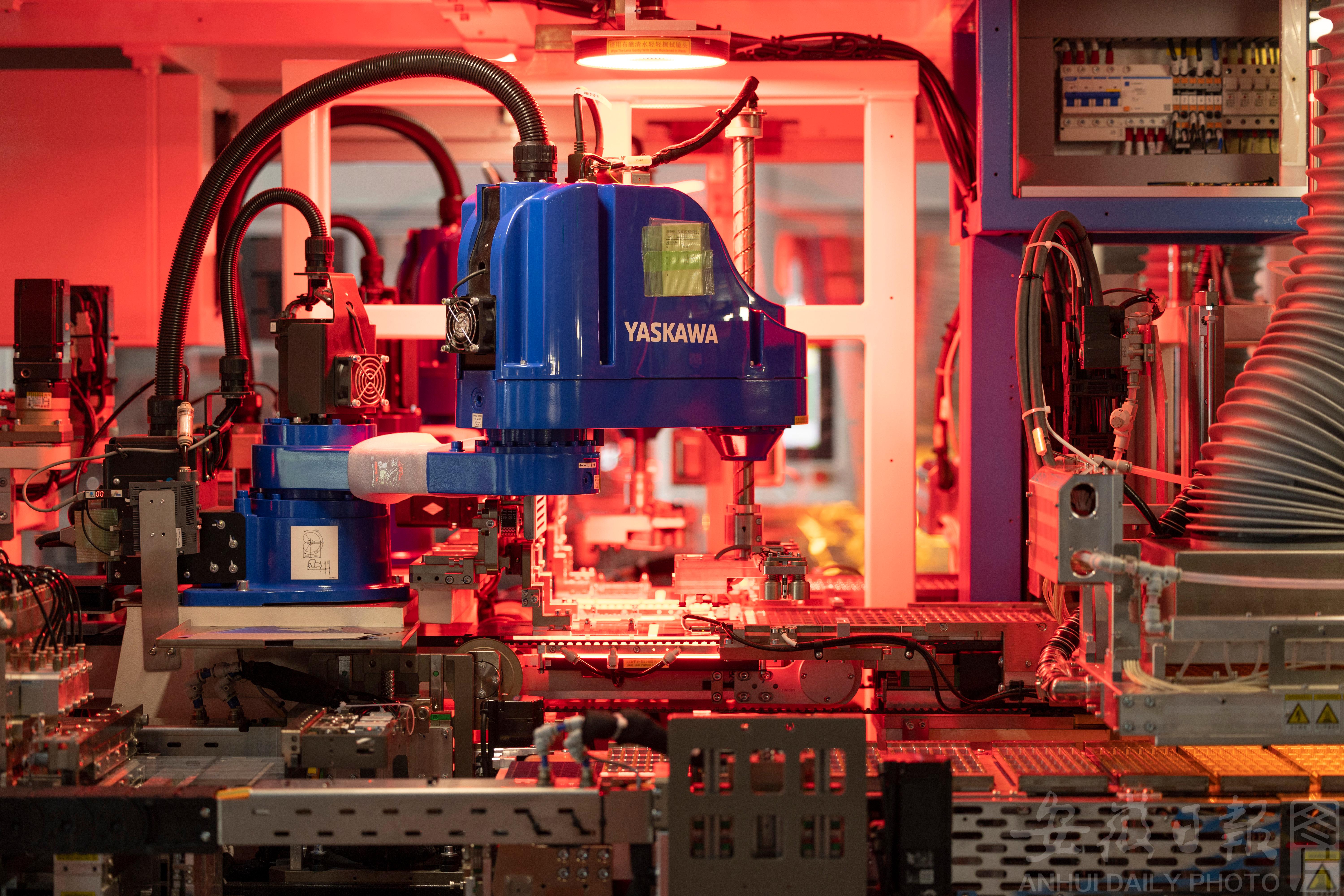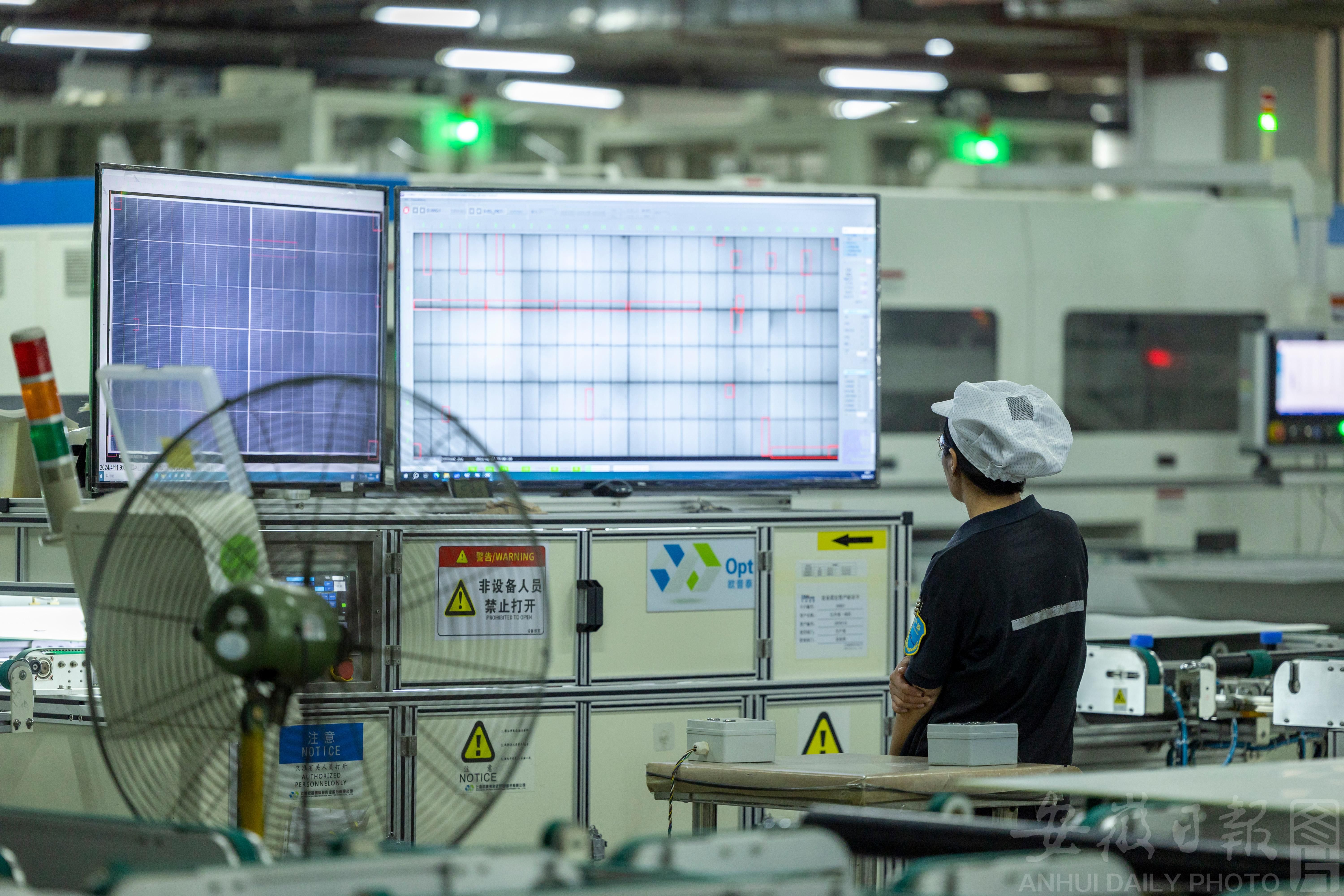 2024年4月11日,在合肥庐阳经济开发区大恒能源科技有限公司太阳能光伏组件生产基地,工人正在利用自动化设备对产品进行检测。近年来,该企业不断加大研发力度,通过产品迭代更新,生产制造全球专利全面屏TOPCon系列组件,并通过自动化设备改造,提升产品质量和生产效率,目前企业75%产品远销海外,订单已排到今年8月。本报通讯员 赵明 摄