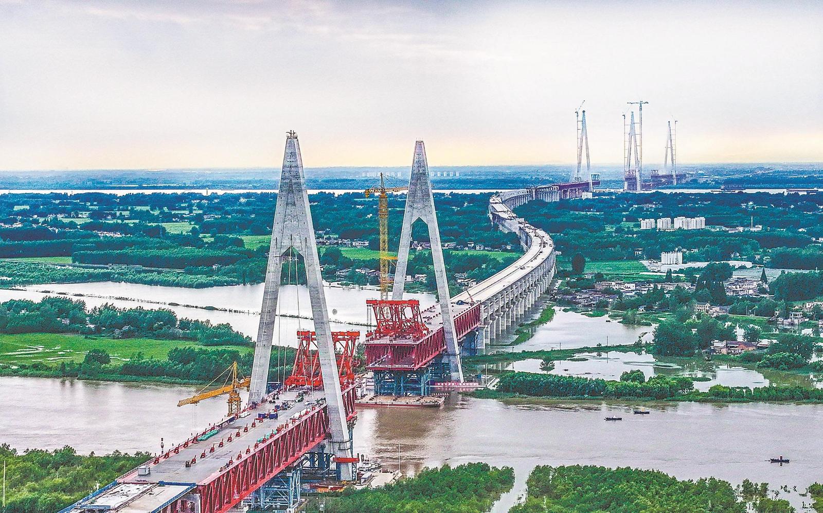 连日来,巢马城际铁路马鞍山公铁两用长江大桥加紧建设。马鞍山公铁两用长江大桥是巢马城际铁路全线控制性工程,全长9.8千米,设计为三塔两大跨钢桁梁斜拉桥,为世界上首座双主跨超千米的三塔斜拉桥、世界最大跨度三塔斜拉桥,同时也是世界上最长联钢桁梁斜拉桥。特约摄影 王文生 摄