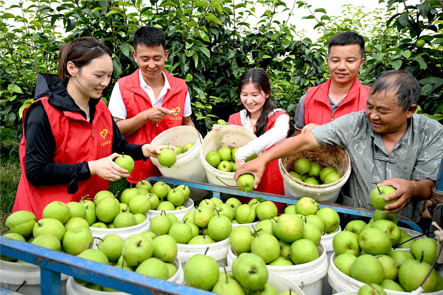 日前,在亳州市利辛县巩店镇金果生态梨园,志愿者在帮助果农采收翠冠梨。亳州市因地制宜发展集观光旅游、生态采摘于一体的特色农业经营模式,带动群众增收致富。本报通讯员 刘勤利 张玉雯 摄