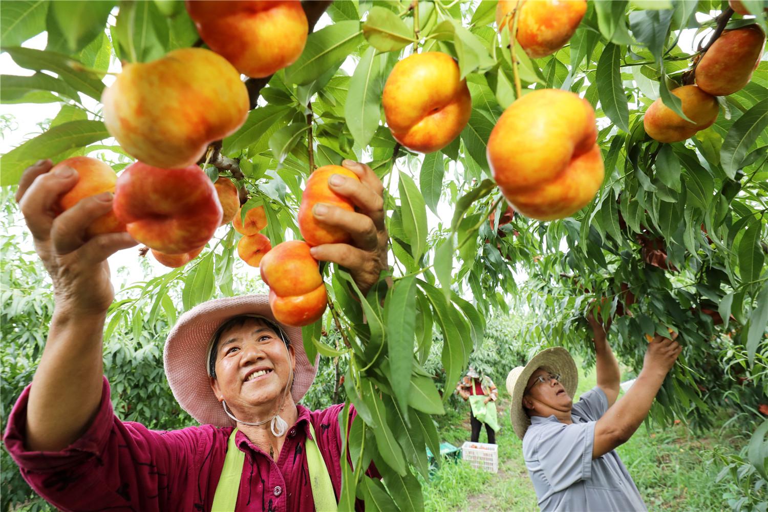 7月7日,在淮北市杜集区刘庄村泛华种植家庭农场桃园里,果农们正在采摘分拣蟠桃。近年来,当地因地制宜发展绿色种植产业,助力农民增收致富。本报通讯员 李 鑫 张启民 摄
