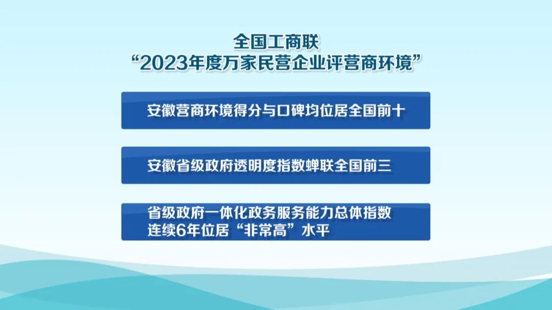全国工商联“2023年度万家民营企业评营商环境”显示,安徽营商环境得分与口碑均位居全国前十;安徽省级政府透明度指数蝉联全国前三,省级政府一体化政务服务能力总体指数连续6年位居“非常高”水平。