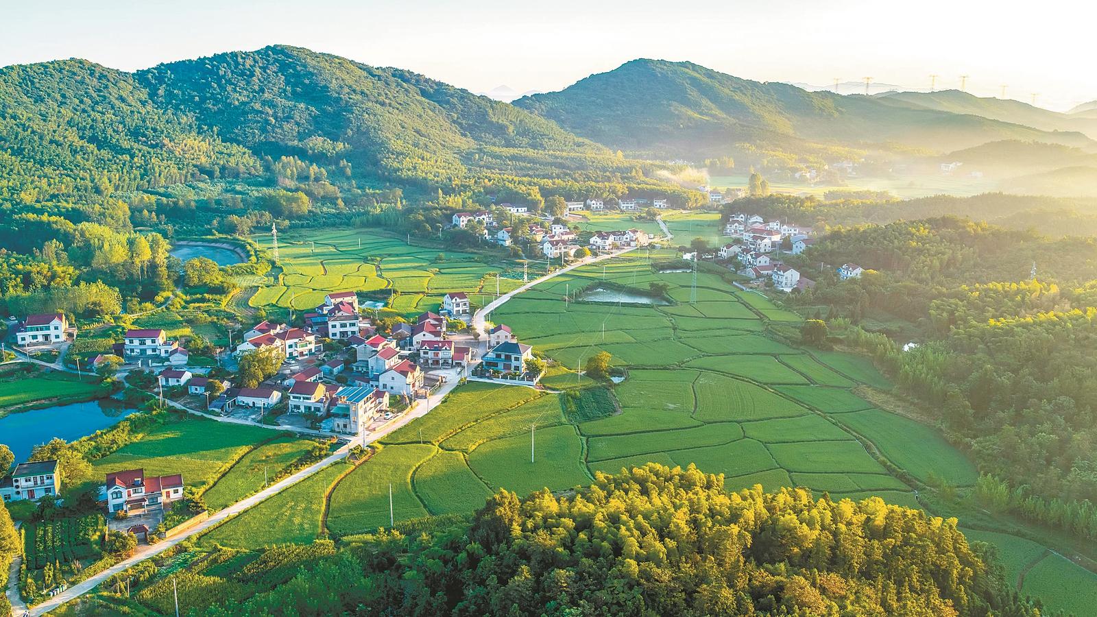 8月18日拍摄的池州市贵池区墩上街道低岭村,错落有致的民居与田园、青山、道路等相映成景。近年来,当地坚持生态优先、绿色发展理念,结合美丽乡村建设,推进村容村貌整治,打造更加生态、美丽、宜居的和美乡村。通讯员 何清 摄/视觉安徽
