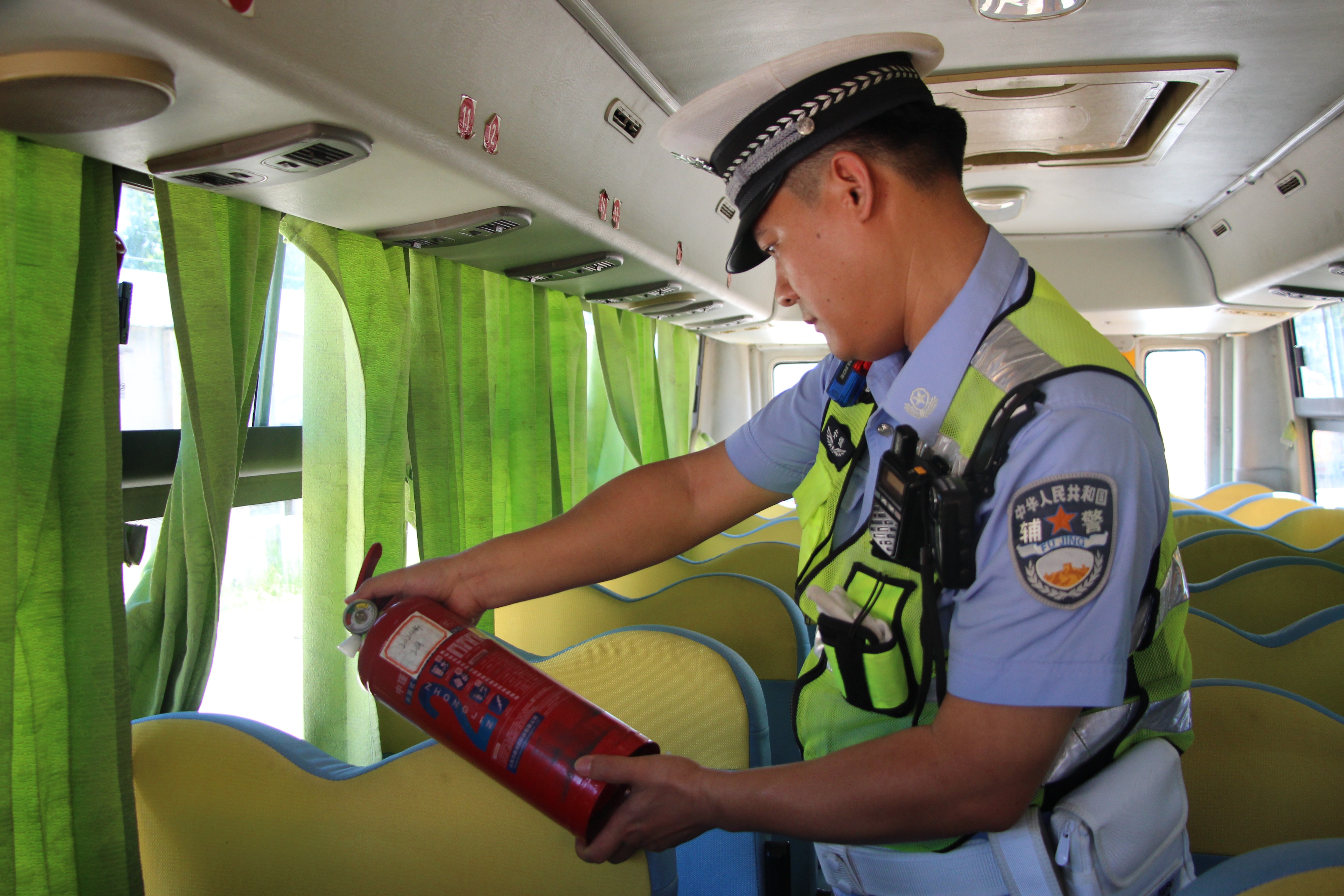 民警手持检查设备,深入车辆底部,仔细查验轮胎花纹深度、刹车系统灵敏度;登车逐一测试每个座位的安全带是否有效;核对灭火器压力、安全锤位置、急救箱药品是否齐全且在有效期内。