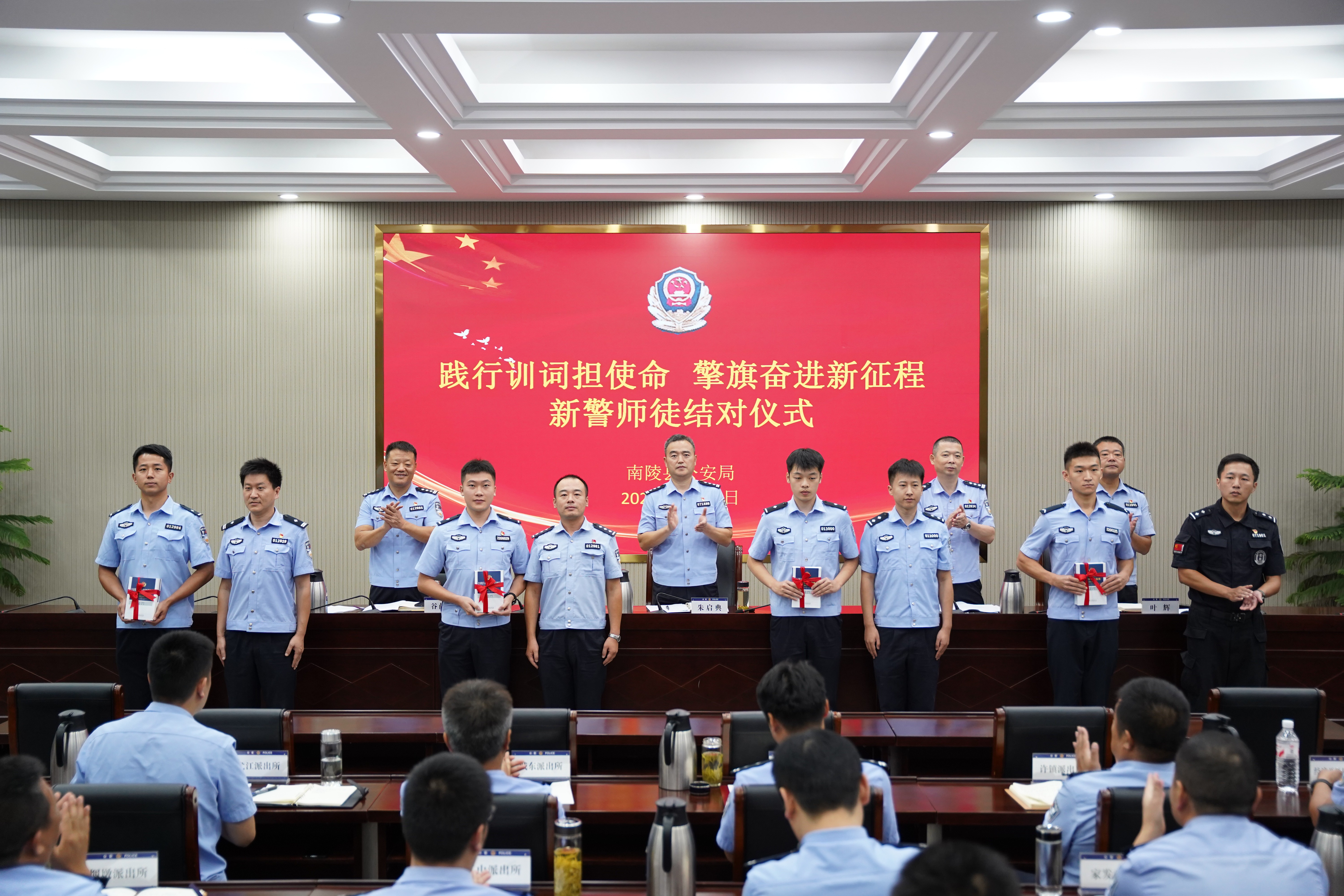 8月26日上午,芜湖市南陵县公安局举办新警师徒结对仪式。此次仪式旨在让新警传承训词精神,在老民警的带领下,尽快成长为合格的人民警察,为维护社会稳定、保障人民安全贡献力量,在新征程上续写公安事业的新篇章 。(程多 徐展 安徽经济报融媒体记者 张传兵)