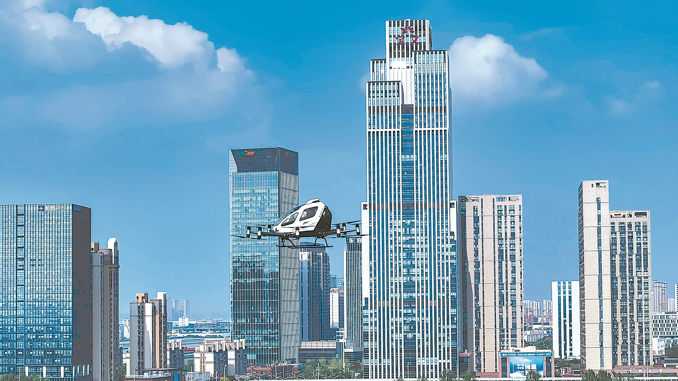 合翼航空运营的EH216S无人驾驶载人航空器在合肥上空飞行。(资料图片)