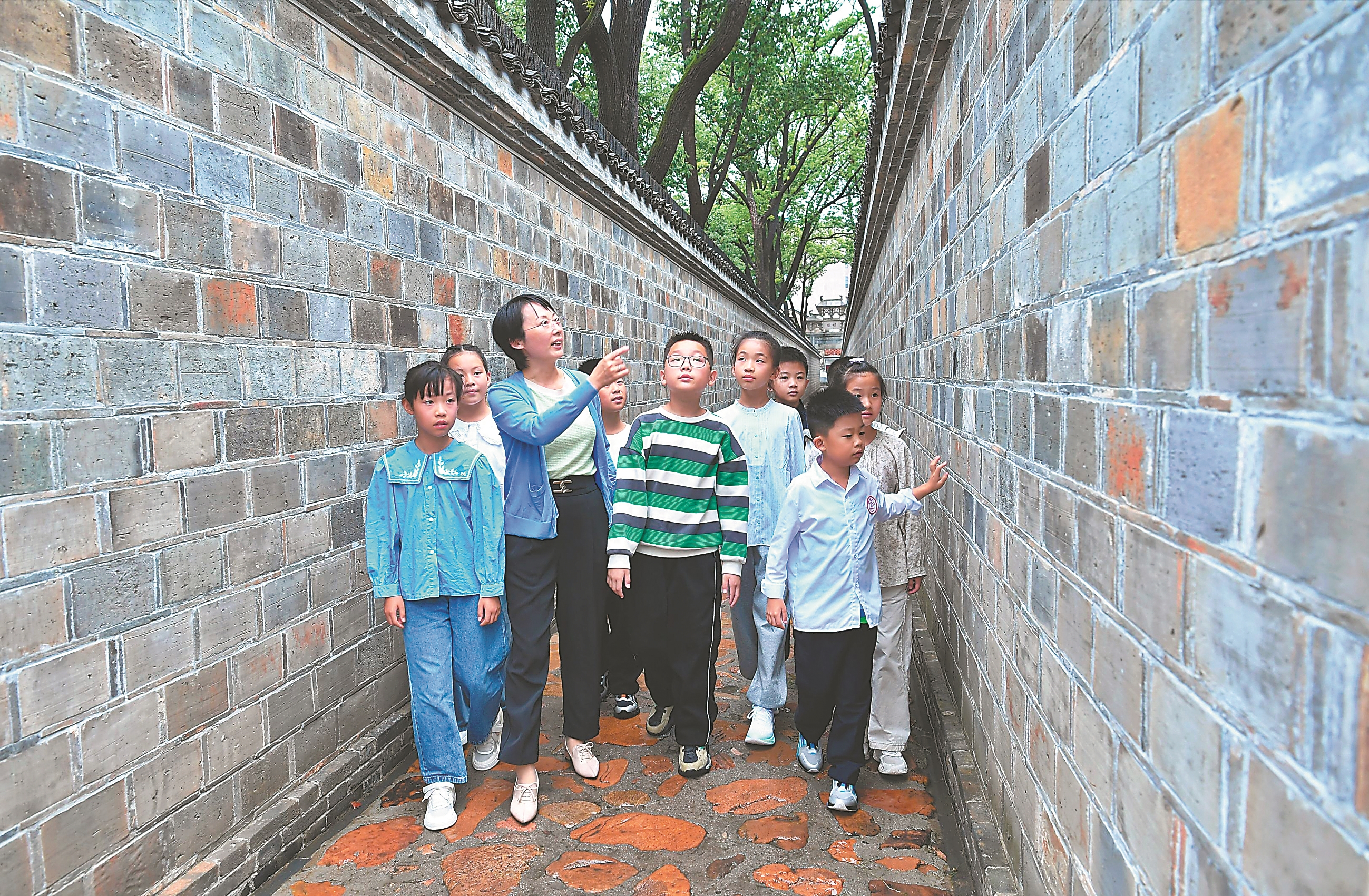 桐城市北街小学学生在老师带领下,在六尺巷学习典故。(资料图片) 本报记者 程兆 摄