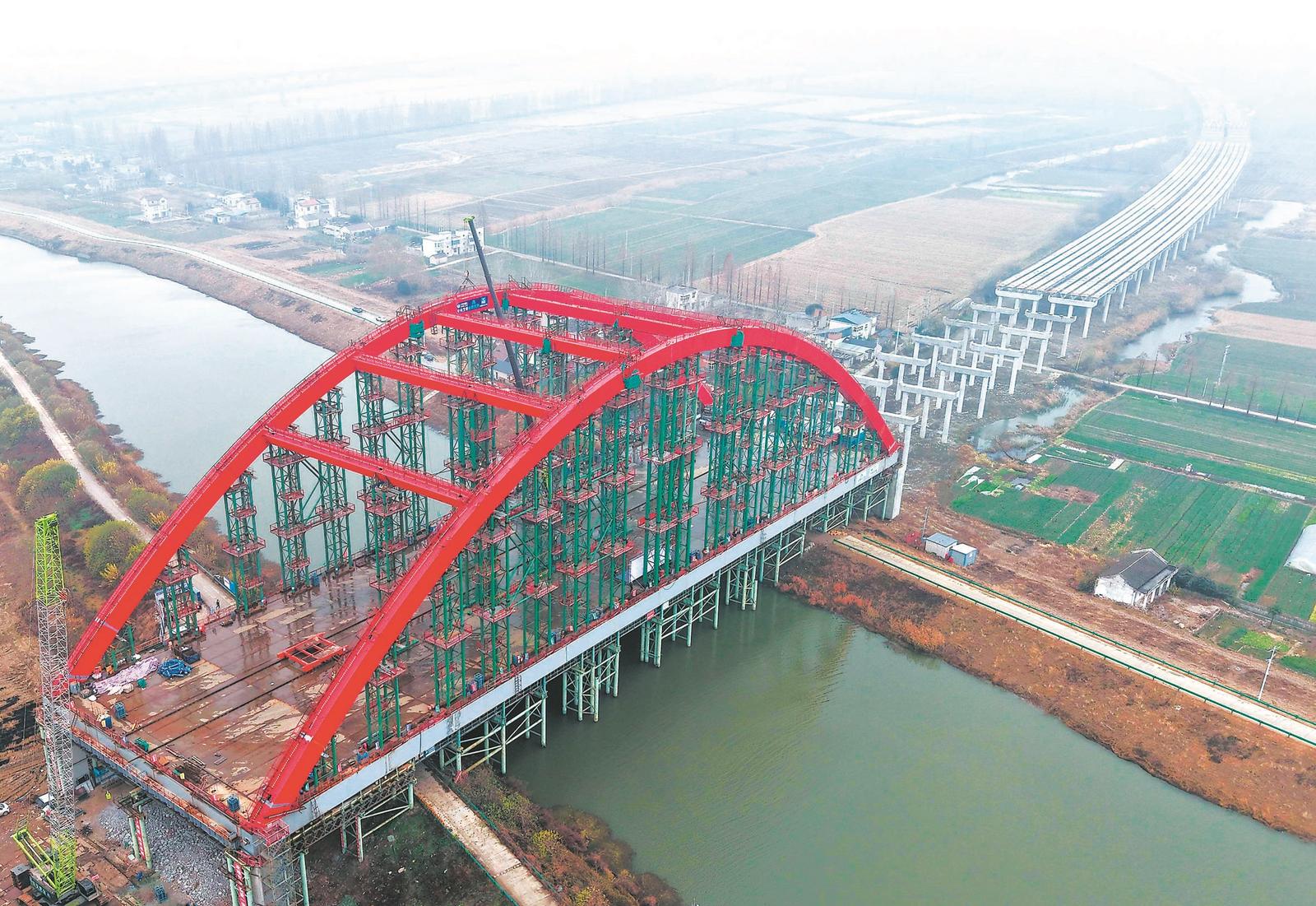 12月13日,巢湖市,随着最后一节拱肋精准吊装到位,S18宁合高速柘皋河特大桥主桥拱肋合龙。S18宁合高速合肥段是合肥都市圈环线G9912中南环线的东段,建成后将助力合肥都市圈的经济发展,为长三角一体化高质量发展注入交通动能。通讯员 马丰成 摄