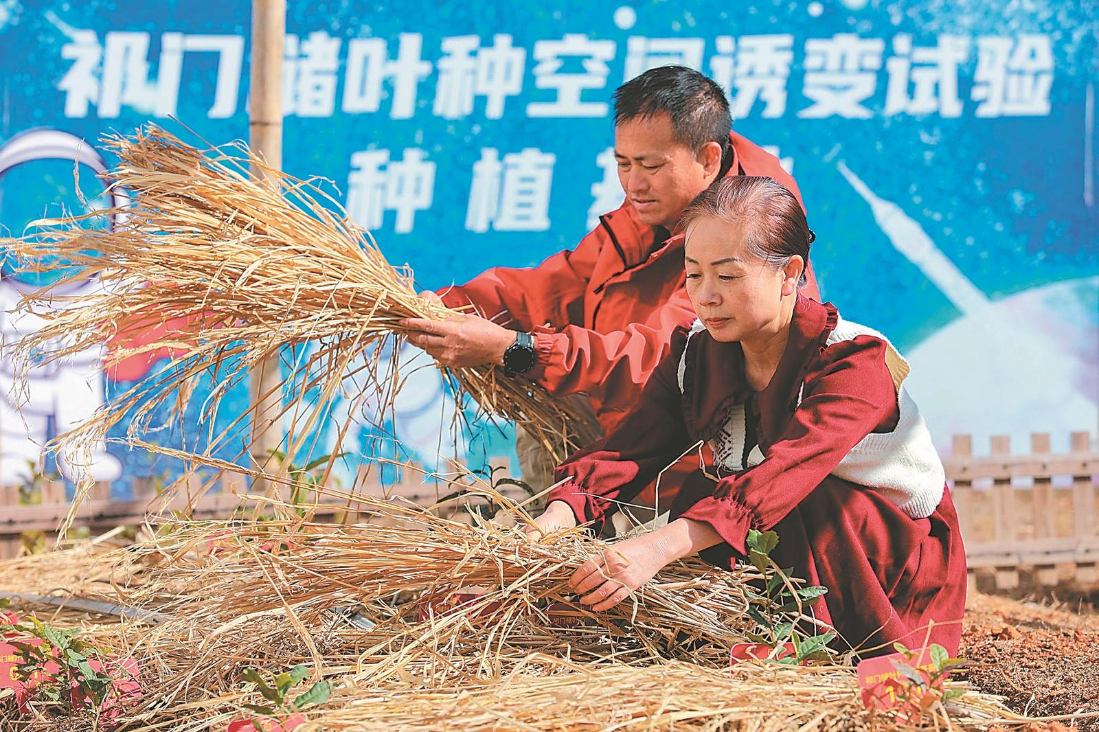 近日,祁门县平里镇产业园内的祁门槠叶种空间诱变试验种植基地里,技术人员忙着为“太空茶苗”覆盖秸秆,保障其安全越冬。通讯员 樊成柱 摄