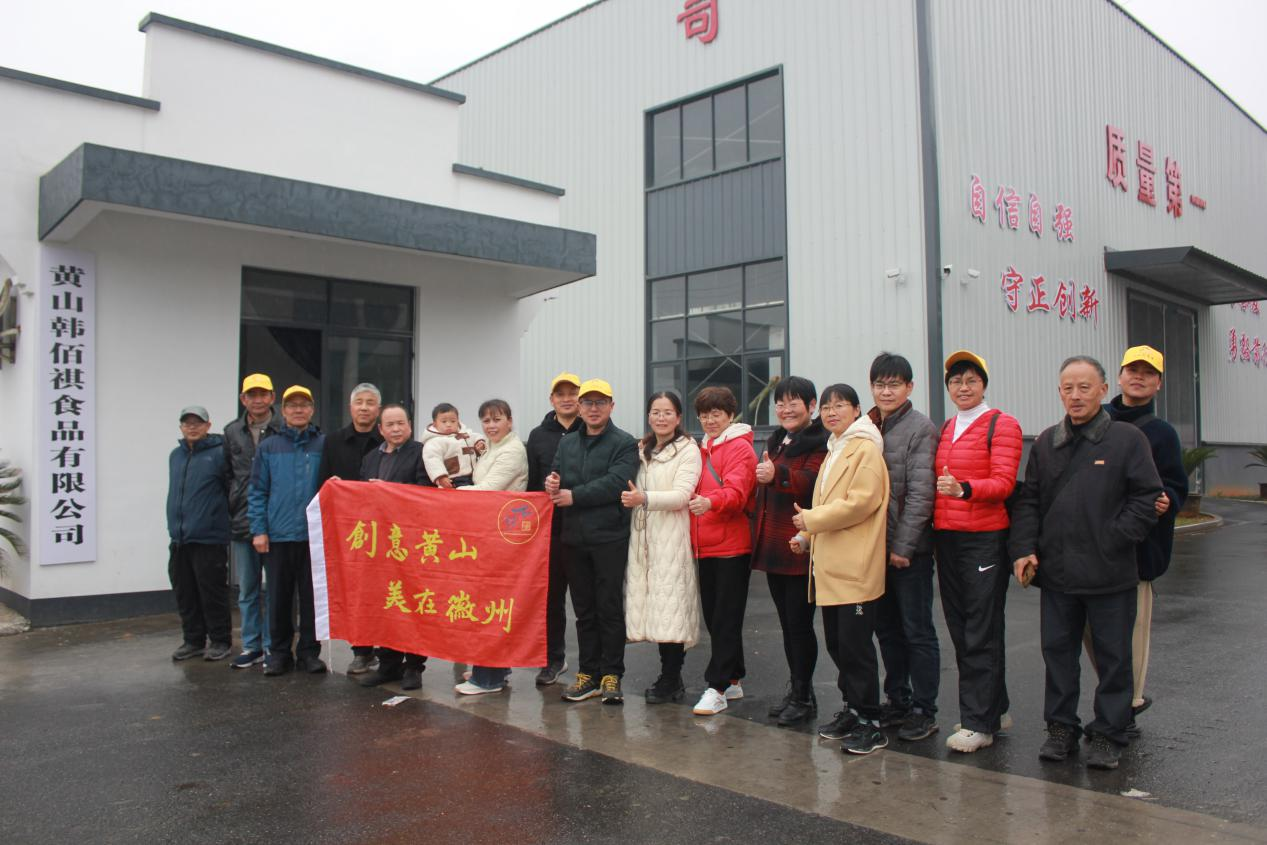 之后,大家又兴致勃勃地参观了休宁城郊的黄山韩佰祺食品有限公司,该公司主打的“韩氏烧饼”技艺远近闻名。公司董事长韩佰祺介绍,韩氏烧饼最早诞生于1342年,创始人韩正罡,娶妻洪氏。1357年,朱元璋率军征战徽州,兵败路过徽州古城新南街1号韩氏百堂,当洪氏得悉朱元璋及士兵饥肠辘辘,她与丈夫拿出店中刚出炉的烧饼招待众人。朱元璋称帝后,称此饼为“救驾烧饼”,后改为韩氏烧饼。韩氏烧饼第二十八代传承人韩佰祺从小就跟随父亲学习制作烧饼手艺,开办了“黄山韩佰祺食品有限公司”,公司建立后,实行规模化、机械化批量生产烧饼,强调做“品牌烧饼”“良心烧饼”,销售业绩一路看好,实现年产值达600余万元。如今,韩氏烧饼被授予“安徽省著名商标”“安徽省老字号”“黄山名牌产品”等一系列荣誉,同时荣获六项国家专利,其本人被评为“徽州烧饼市级非物质文化遗产传承人”。