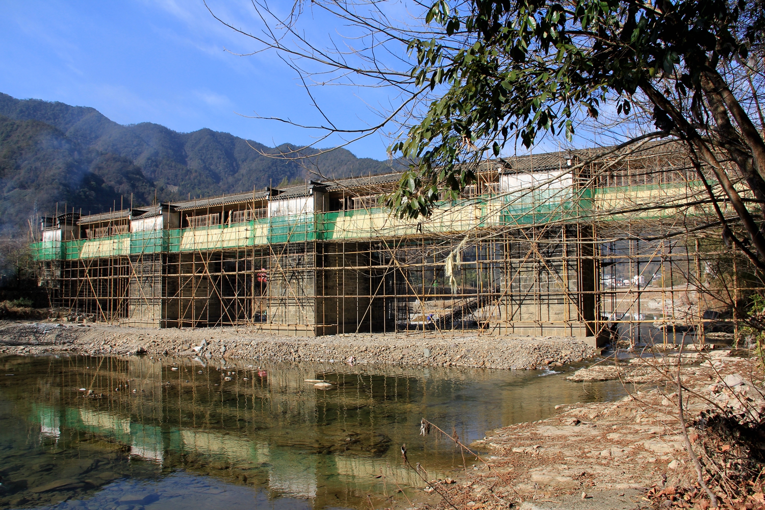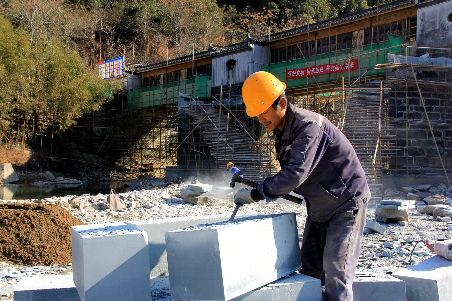 在施工现场,只见古桥的四周和下面全部安装了脚手架和安全防护网。施工人员冒着严寒,按照施工技术要求,对维修桥墩的石材进行加工,对桥梁周边的垃圾杂物杂木杂草进行清理,各项工作井然有序地稳步推进。