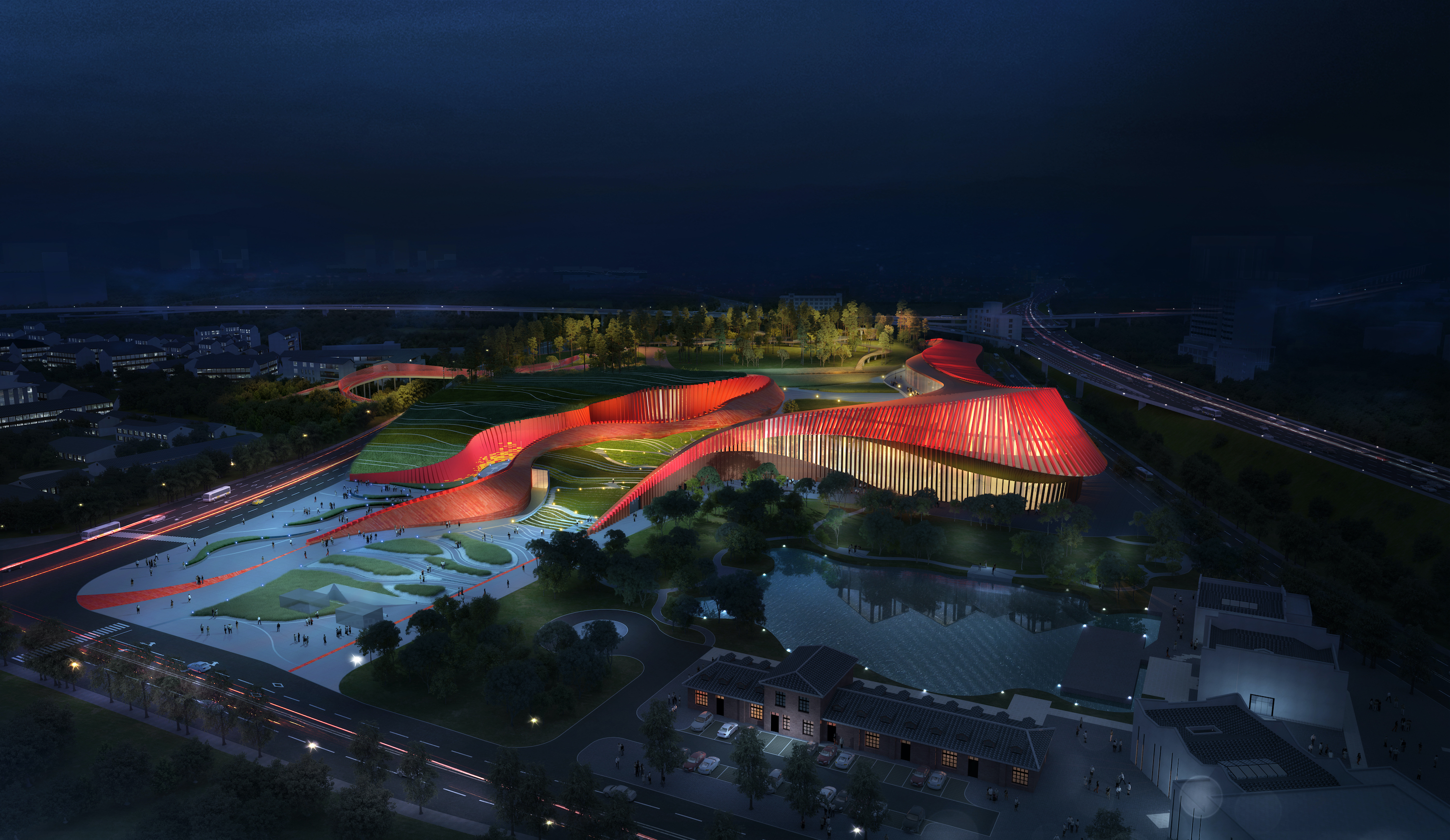 “双子星”之一,是贵州长征文化数字艺术馆“红飘带”。该项目的选址就颇显深意,因为它可能是部分游客在落地贵州前用眼睛“打卡”的第一个项目,也即对贵州的第一印象就是“红色”:乘坐航班前往贵阳的游客,若在贵阳龙洞堡机场上空俯瞰,可发现有一座巨型建筑铺展在青山绿水之间。它由一块块红色的曲面幕墙构成,此起彼伏,形成了连续转折的动态轮廓,犹如一条灵动的“红飘带”。它就是全国首个以长征为主题的全域沉浸式数字科技体验馆,也是长征国家文化公园贵州重点建设区的标志性、引领性工程。