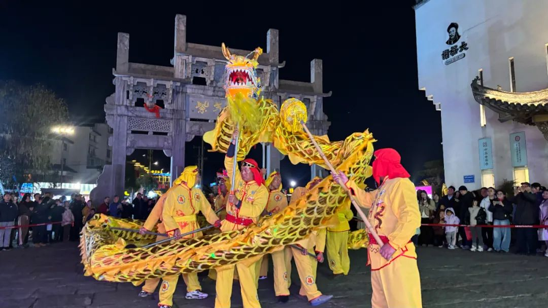 19点40分,老街照壁广场灯火辉煌,活动拉开帷幕。屯溪舞龙作为开场重头戏,两条色彩斑斓的布龙在龙珠的引领下,随鼓乐起舞,展现出龙的精、气、神、韵,精湛的技艺赢得了现场阵阵掌声。紧接着,屯溪舞狮震撼亮相,北狮的雄壮与威猛在锣鼓声中尽显无遗,寓意着喜庆与吉祥。