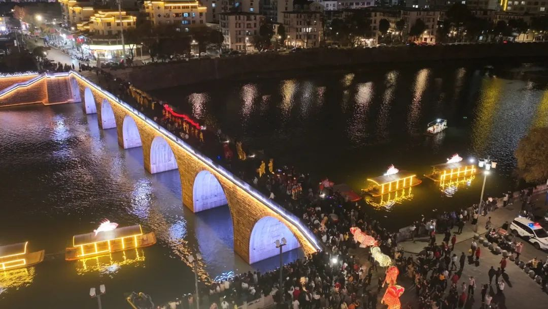 在屯溪河街,鱼灯璀璨点缀竹筏,与岸边嬉戏的大小鱼灯交相辉映,共同营造出温馨喜悦的新年氛围。江畔音乐会以夜色为帷幕,山水为舞台,用音乐唱响新年的美好祝福,让市民游客在音乐与灯光中感受国际屯溪的魅力。