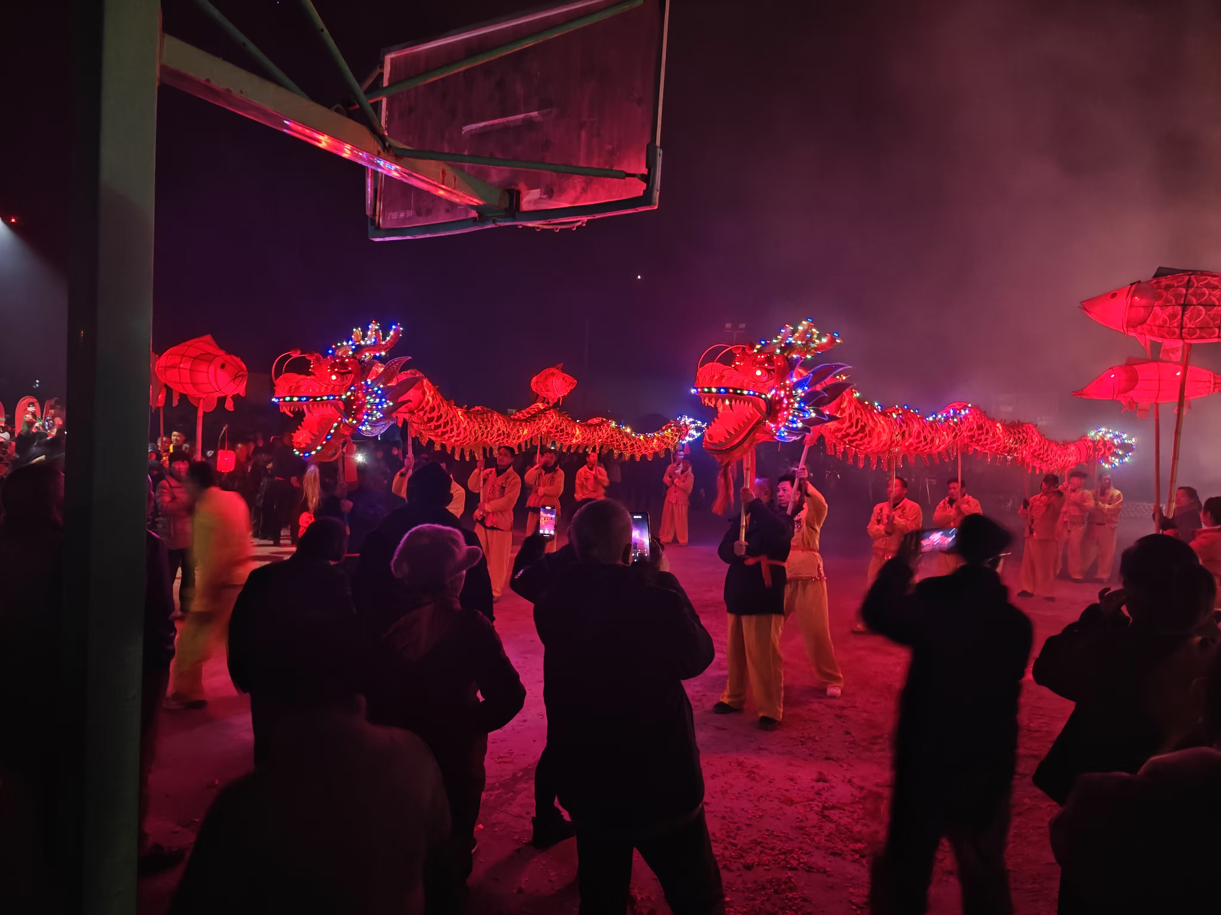 饭点刚过,路的两边就被里三层、外三层围得水泄不通。伴随着村民“龙灯来了,龙灯来了!”的欢呼声,两条10多米长的红色龙灯如同一条火龙,时而左右盘旋,蜿蜒游走,时而昂首向上,如蛟龙出海,舞出对美好生活的向往。舞龙队伍每到一户人家的门口,村民纷纷用鞭炮和烟花迎接,不少人用手机记录下一个个精彩瞬间,让新丰乡的节日氛围感拉满。