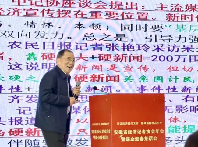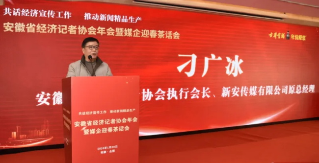 安徽省经济记者协会执行会长刁广冰在致辞中说,在省委宣传部、省工信厅和省记协的领导指导下,安徽经济记者协会秉持办会宗旨,建平台、强服务、当好新闻界与经济界的桥梁和纽带。在新的一年里,安徽经济记者协会愿携手各成员单位、及以古井集团为代表的著名企业,加强媒企业融合,主动创新有为,共同践行“唱响经济宣传主旋律”这一伟大使命。