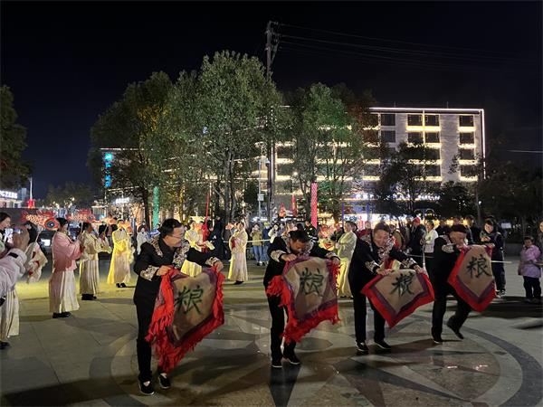 18时58分,民俗表演在承启广场正式开启。由汤口民宿联盟成员组成的表演队伍,将徽州传统民俗精髓融入表演,还原了古徽州婚嫁“踩粮袋”的经典场景:前一人铺粮袋,后一人紧接而上,步步相承的动作,将“传粮”与“传良”的谐音寓意生动演绎,让现场观众直观领会民俗背后的深意。