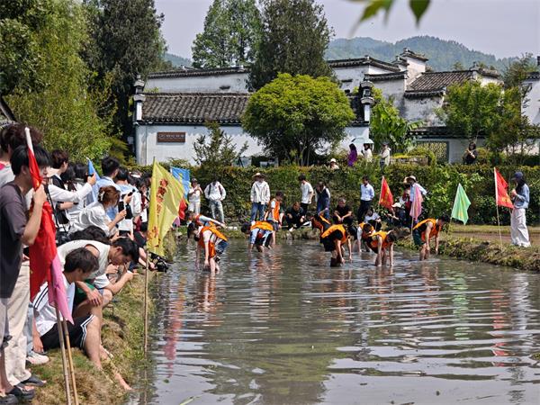 最受瞩目的当属“浑水摸鱼”环节。参赛学生与游客卷起裤腿,徒手在泥水中抓鱼,现场欢声笑语不断,形成一幅生动的“水墨农耕图”。抓到的渔获可免费带走,成为活动的一大亮点。