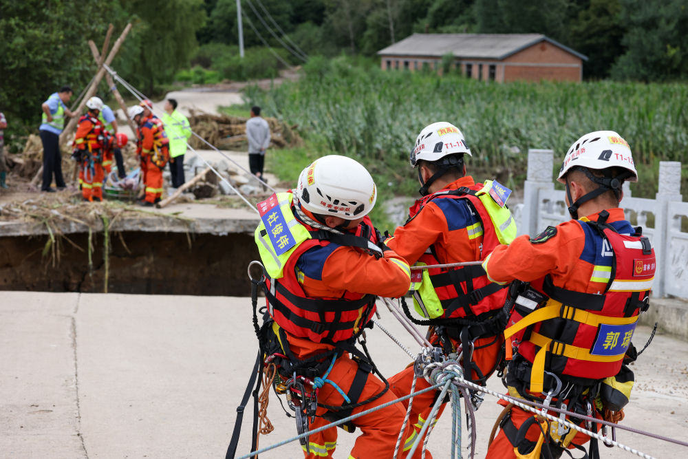在河北保定涞水县,县乡干部翻山越岭,与汤家庄村群众一起,在湍急的河面上拉起一条“生命之绳”。48岁的村民许术宝依靠这条绳索,背出20多名被困村民。