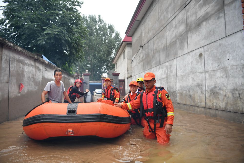 8月3日,衡水市消防救援支队救援人员在涿州市码头镇沙窝村内开展救援工作。新华社记者 牟宇 摄