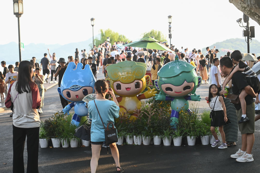 游客在位于杭州西湖景区的断桥边与杭州亚运会吉祥物合影(2023年8月21日摄)。新华社记者 黄宗治 摄