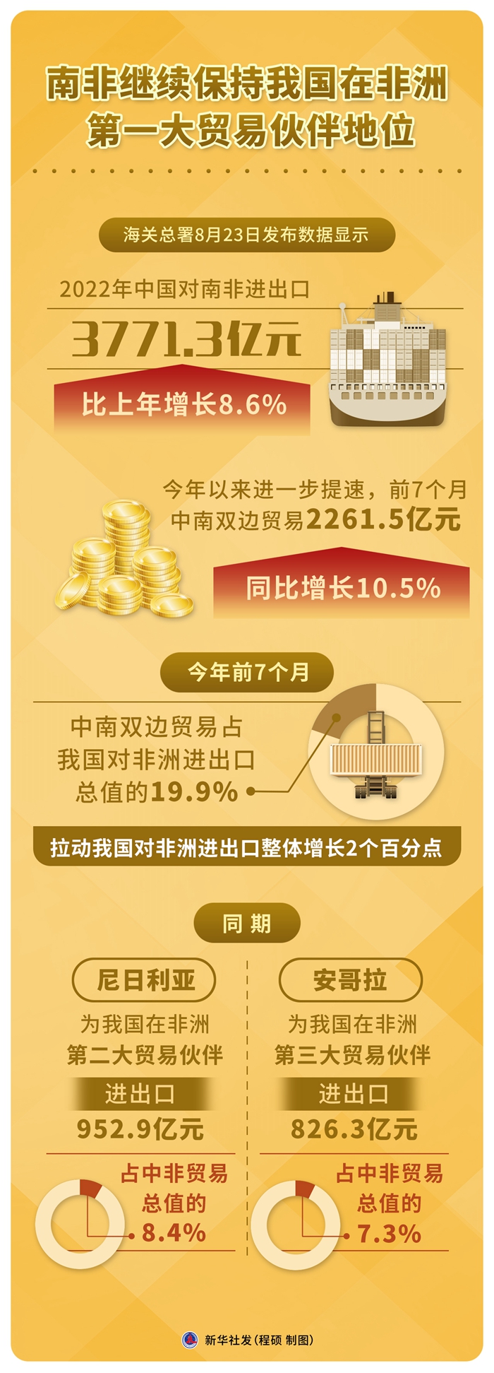新华社北京8月23日电(记者邹多为)海关总署23日发布数据显示,2022年中国对南非进出口3771.3亿元,比上年增长8.6%;今年以来进一步提速,前7个月中南双边贸易2261.5亿元,同比增长10.5%,南非继续保持中国在非洲第一大贸易伙伴地位。