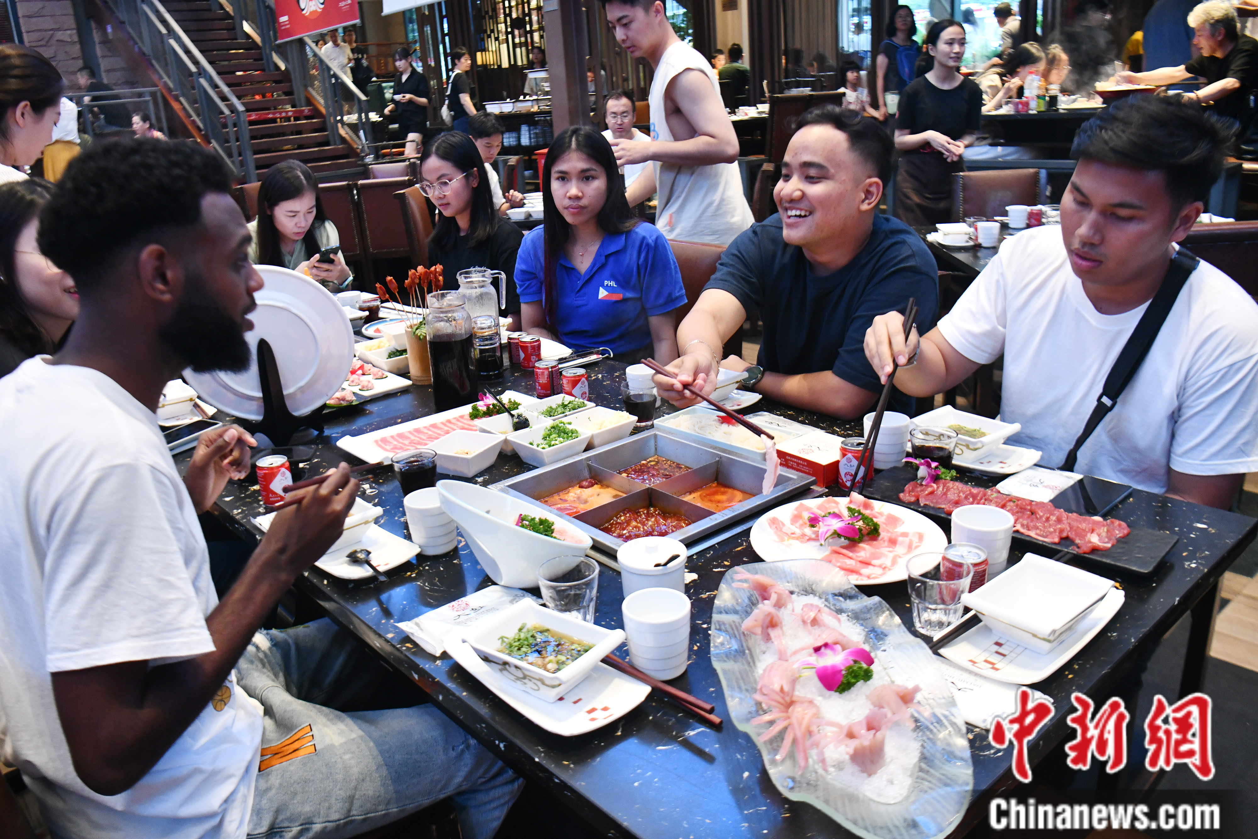 “送血来啦”,服务员边端着鸭血边吆喝,把听懂这个谐音梗的柬埔寨姑娘庄丽贞逗笑得前仰后合。她告诉记者,中国的餐桌上总是有很多种类的菜肴,而柬埔寨餐桌上更倾向于简单的食物。面对毛肚、鸭血、黄喉等,两位外国姑娘丝毫没有怯场,都能很好地“入乡随俗”吃起来。