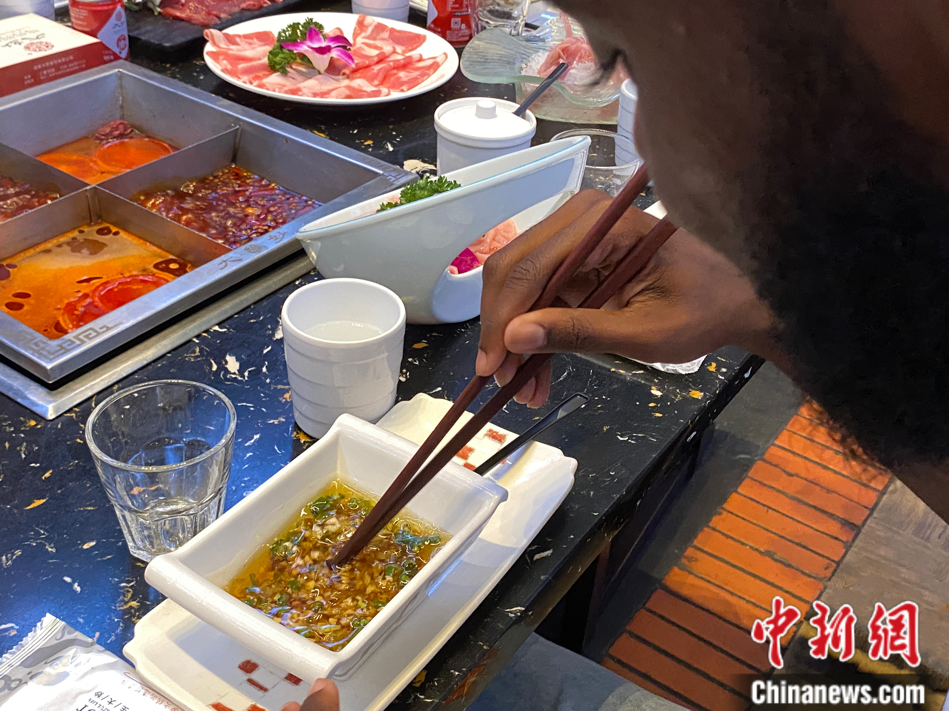 吃四川火锅的前奏曲,必然是从调制蘸料开始。任瑞刚想举着香油干杯就被服务员“制止”。面对桌上种类繁多的配料,这些外国青年们也犯了难。“一勺花生碎、一勺蒜泥、一勺香菜、一勺葱花,再根据喜好加上耗油或者醋,最后倒上香油搅拌”,服务员一步步教大家调制起专属于四川火锅的最佳拍档,外国青年们像进行实验一般认真配比着。