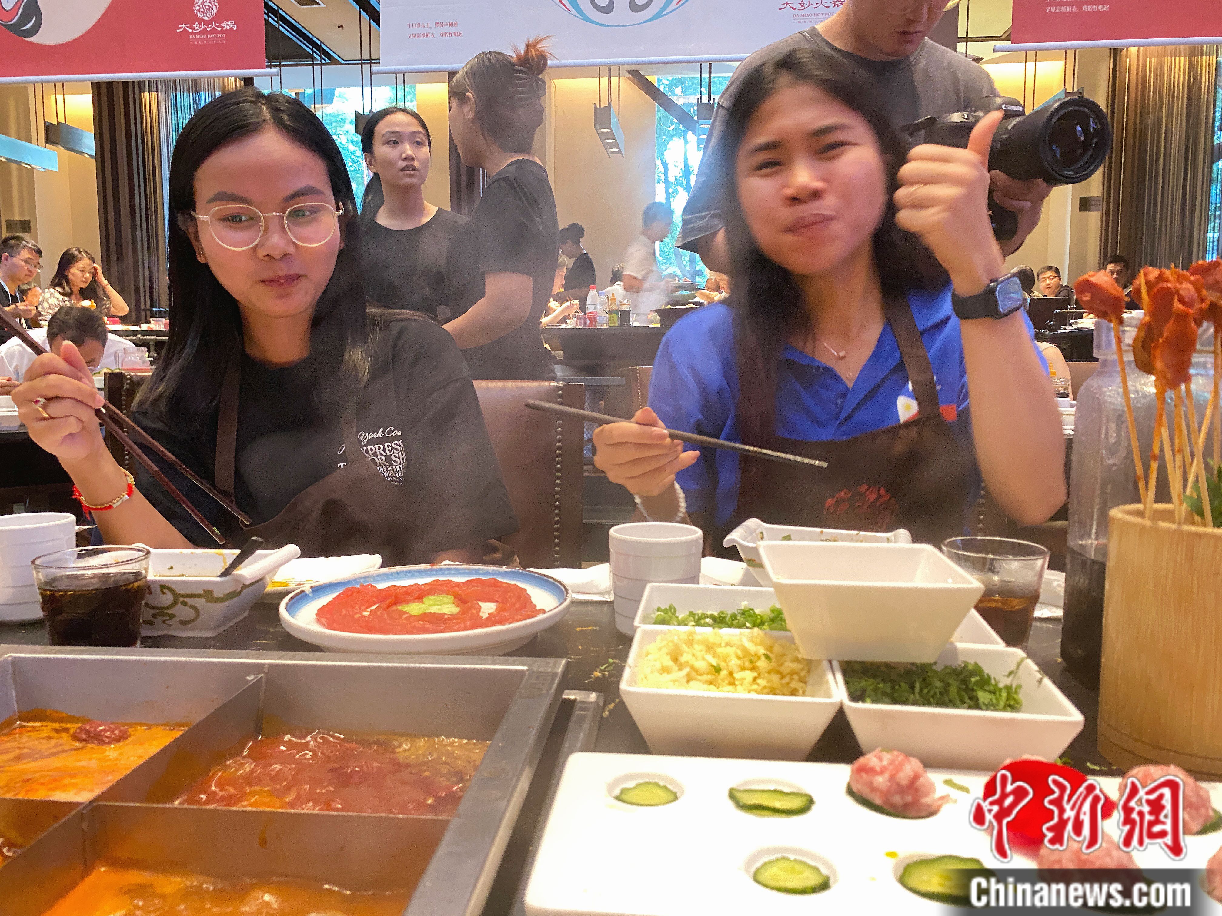 来自菲律宾的格瑞斯和柬埔寨的庄丽贞品尝火锅。苏亦瑜 摄
