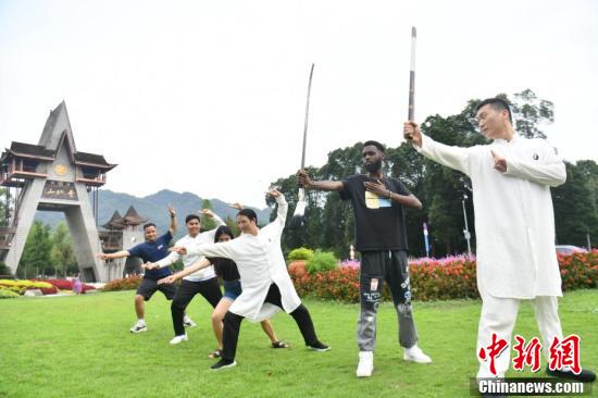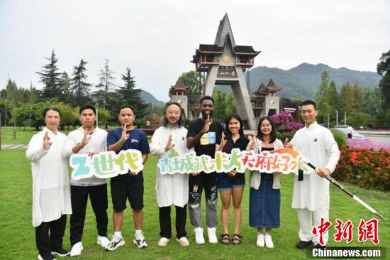 8月23日,“‘Z世代’画像中国”网络互动活动来到四川省都江堰市,来自柬埔寨、古巴、马来西亚、菲律宾的5位外国青年先后游览青城山、都江堰,学习体验青城太极、剑术、茶艺等中国传统文化项目。图为学习中国传统武术的外国青年在青城山山门前合影。