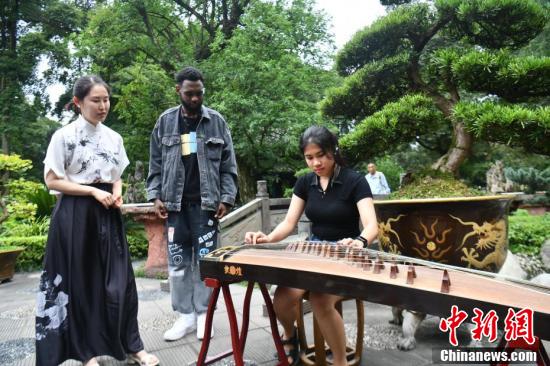 外国青年在都江堰景区内体验古筝弹奏。